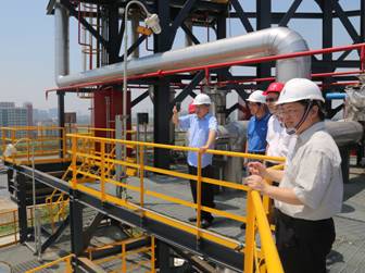 接着,高乙梁顾问一行参观了场站功能区,饶有兴致地登上全容罐顶,俯瞰东部应急气源站全景。集团副总经理王忠平介绍了气源站气化调压系统的工艺流程和相关参数,以及城市天然气的输配系统。