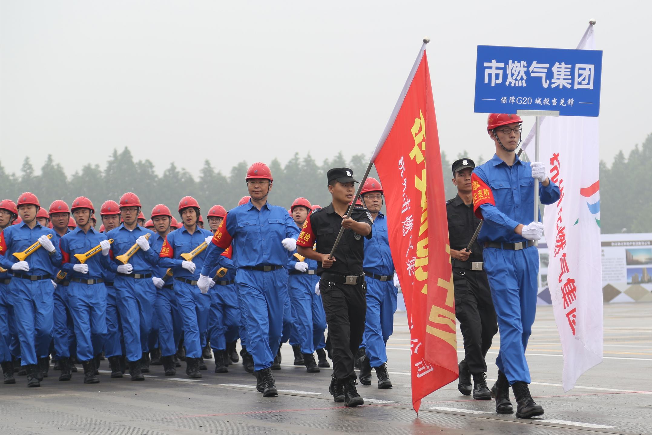 即便是阴雨天气也丝毫无法阻挡燃气人参与大会的热情。8点,全体队列人员与演习人员到达大会现场,精神抖擞、整装待发。10点05分,大会正式开幕,队列方阵首先入场,由党委书记、董事长胥东,党委副书记、总经理王东担任领队的燃气方阵的80余人头戴红色安全帽、身着蓝色工装、手持检漏仪、抄表仪,高喊“燃气安全、责任在先,峰会服务、全力以赴”的口号,步伐整齐、昂首阔步走向主席台,接受领导检阅。方阵成员由来自燃气一线的巡检工、抢修工、抄表工、服务工、热线工、运行工组成。