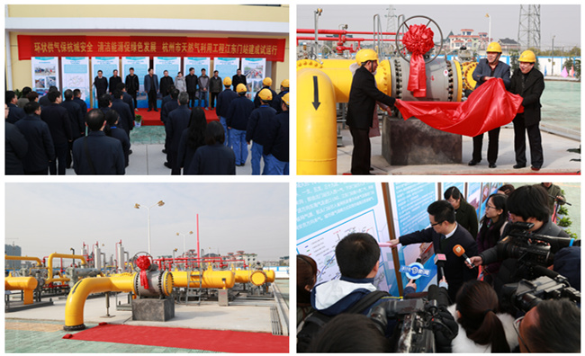对杭州天然气利用工程及江东门站试运行情况实施发布。省发改委卢飞燕、市城投集团副总经理吴桂才、燃气集团党委书记、董事长芦俊与用户代表金柏堂共同为江东门站揭牌。