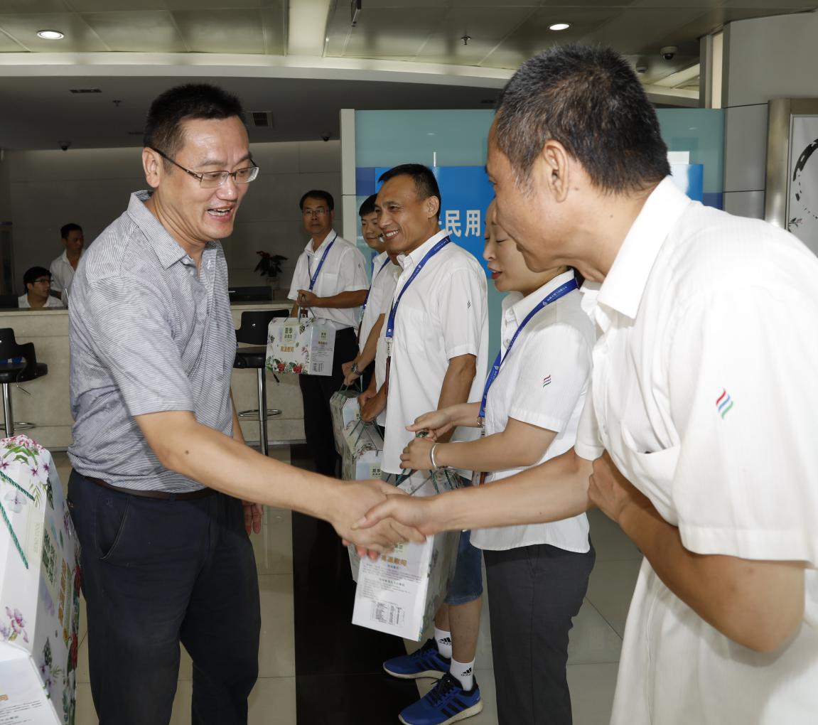 8月4日,市总工会常委、建设工会主任王文贺在集团党委副书记、工会主席俞崇勋陪同下,冒着高温,专程到杭天公司艮山东路营业厅了解一线职工夏季高温防暑降温落实情况,慰问公司劳模代表、“一站式服务”和营业厅工作人员,并送上了市总工会的关怀和慰问品。