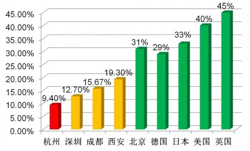 图7:十二五末,杭州市天然气消费占一次能源消费中的占比与部分国内城市及发达国家的比较。