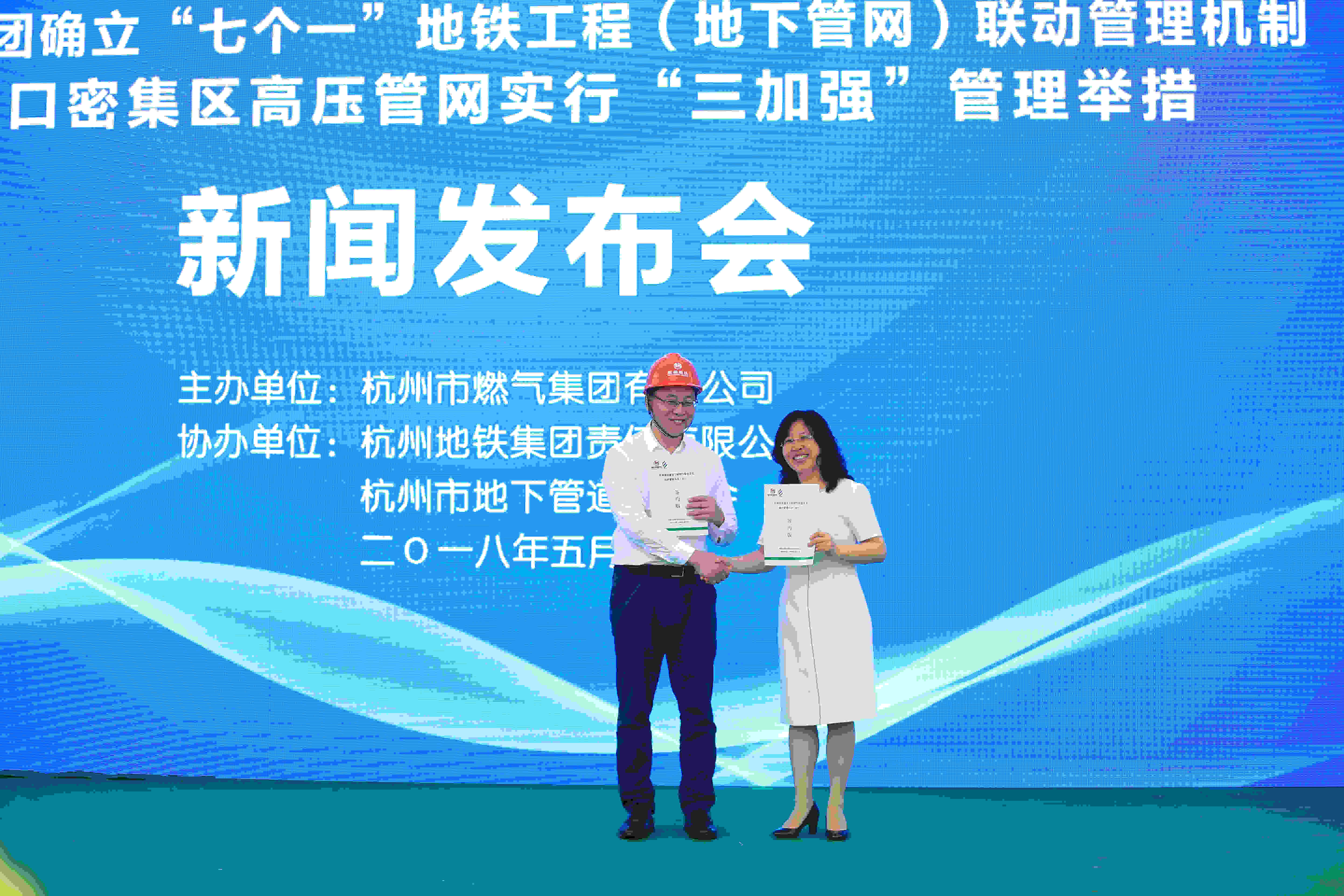 在此基础上,集团为了积极配合城市大建设,确保大安全,全面推动“七个一”地铁工程(地下管网)长效联动管理机制,深化现场管理“七个一”,确立管理机制“七个一”,即:一份保护协议责任清单;一名管道专管员对接工作;一系列燃气安全培训;一张《动土令》执行票;一站一专项应急响应预案;一排名红黑榜;一年联合检查全覆盖。在集团推动下,“七个一”地铁工程(地下管网)长效联动管理机制得到地铁集团的大力支持,双方联合发文《杭州地铁建设工程燃气管道安全保护管理办法(试行)》,并在发布会上进行备忘录文本互换。