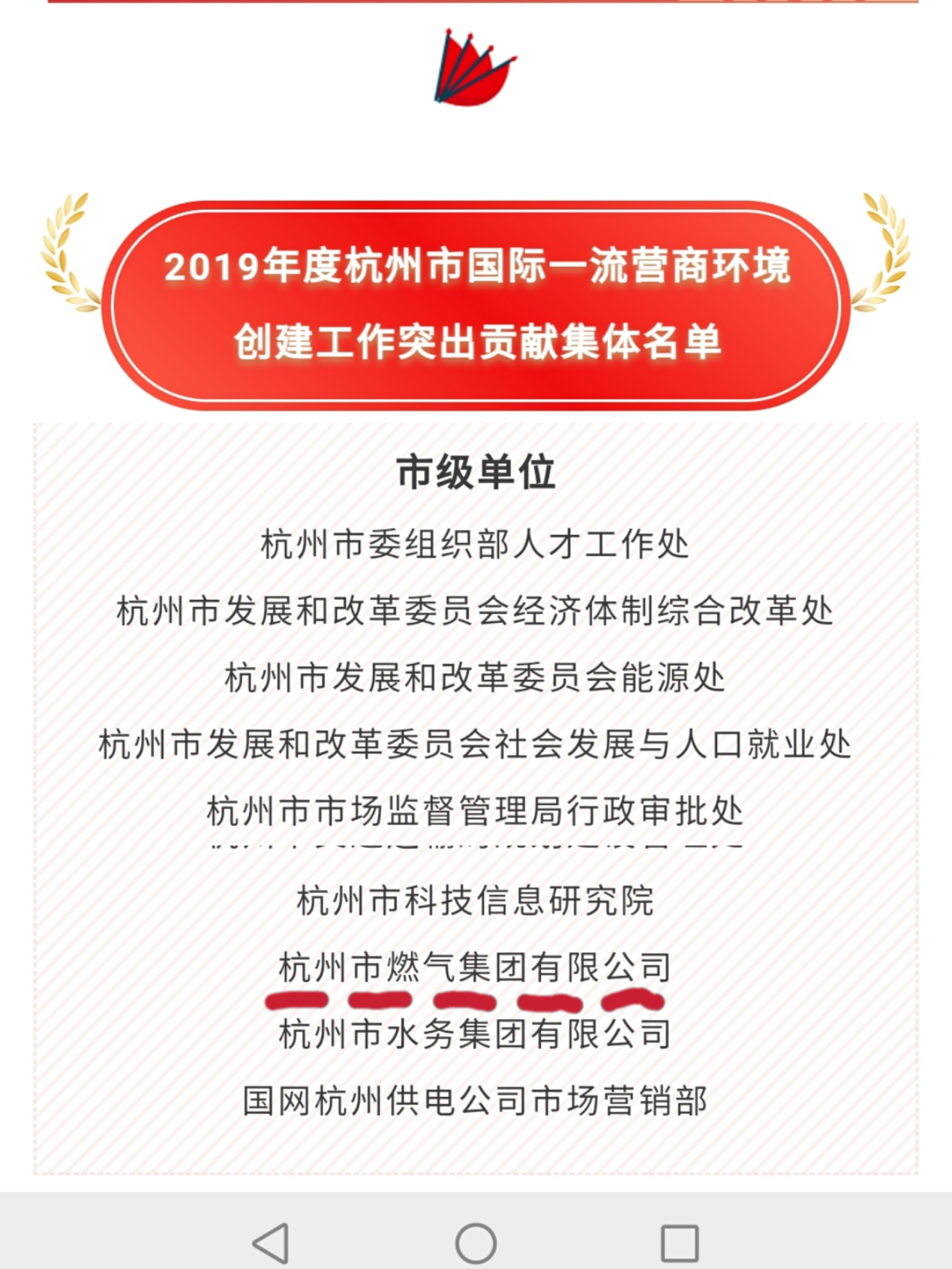 近日,欧美成人视频 有限公司被市委、市政府授予“2019年度杭州市国际一流营商环境创建工作突出贡献集体”。在国家发改委发布的《中国营商环境报告2020》中,杭州营商环境评价总体排名全国第五。欧美成人视频 作为用气报装标准优化和提升的责任主体,深入贯彻落实市委市政府决策部署,勇担重任、真抓实干,深挖内部潜力、创新服务举措、降低用户门槛,不仅真正提高了用户的获得感和满足感,更为全市营商环境评价取得优异成绩作出了积极的贡献。