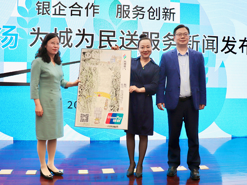 党委副书记、总经理朱琴君与农行浙江省分行信用卡中心总经理周孟斌,共同为首位“瓶改管”助力贷用户倪幼红颁发农行杭燃联名信用卡。