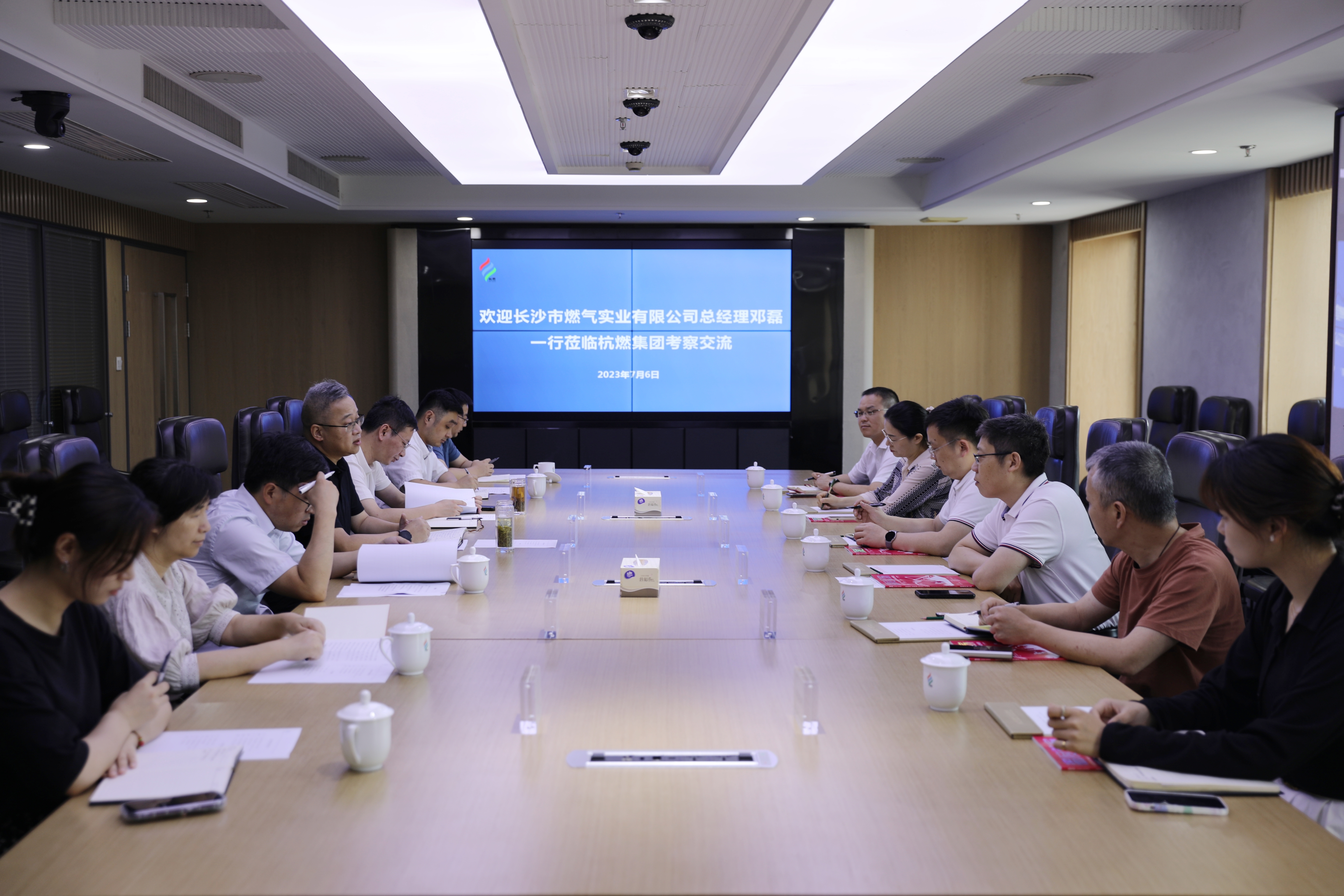 2023年7月6日下午,长沙市燃气实业有限公司党委副书记、董事、总经理邓磊,党委副书记、监事会主席、工会主席曹军辉一行六人到访欧美成人视频 考察交流。欧美成人视频 党委副书记、总经理俞峻,党委委员、副总经理徐小冬,办公室、综合管理部、建设发展部、企业管理部相关负责人参加。邓磊一行在杭燃应急指挥中心观摩了欧美成人视频 发展48周年欧美成人视频文化 宣传片和欧美成人视频 数字平台。在听取了杭燃“四大产品”情况介绍后,双方座谈交流。