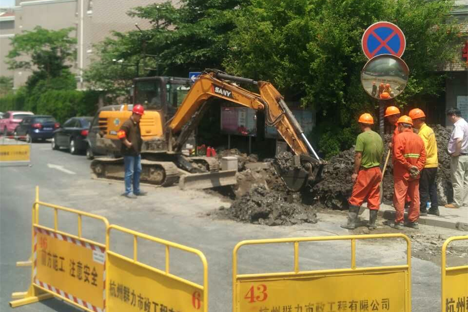 工程虽已经顺利完成,但整个过程可谓“一波三折”:因工程要求,时间紧迫,前期申报审批时间根本不够;由于小区为封闭式管理,尽管早已通知物业,但施工经常因为作业路段两侧车辆占道无法进行;小区内路面狭窄,挖机无法进入,大部分依靠人工开挖,而且地下各类管线密集复杂,再加上连续降雨,使得施工进程缓慢。
