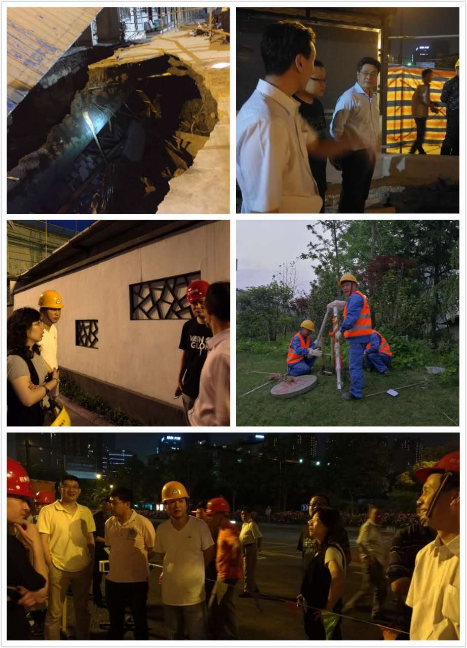 5月7日16时05分左右,杭天公司接到秋涛路解放路东北角杭州新阔实业投资有限公司报警:施工工地发生塌方,要求对现场燃气管线进行检查。公司立即指派抢修及巡检人员赶赴现场。16:30左右,巡检人员在解放东路秋涛路交界东北角工地发现,该处管线为中压A、DN500钢管,为钱江新城主供管道,工地塌方处正处燃气管线上方,工地现场沉降严重,引起自来水管爆裂,导致一米左右距离的燃气管线存在重大安全隐患。巡检人员依照安全第一、速度第一的原则,第一时间报抢修中心,抢修人员接警后,火速赶往现场,同时巡检人员做好现场监护,并用激光检漏仪巡查沉降区域,经仔细检查后未检测出燃气泄漏,公司相关负责人第一时间赶赴现场进行指挥工作,抢修人员到达现场后确认燃气管线暂无泄露现象,且暂处平稳状态,抢修撤回。18点左右,塌方处房子上的砖块掉落,导致自来水管爆裂,水管抢修开挖点离燃气管线仅1米,为确保不发生次生灾害,现场负责人决定要求抢修人员回到现场待命。现场一面墙突然坍塌,在查看管位及附近用户用气情况下,抢修班果断切断塌陷区域管线,并放散降压,确保万无一失。随后,巡检人员现场多次检测未发现燃气泄漏。
