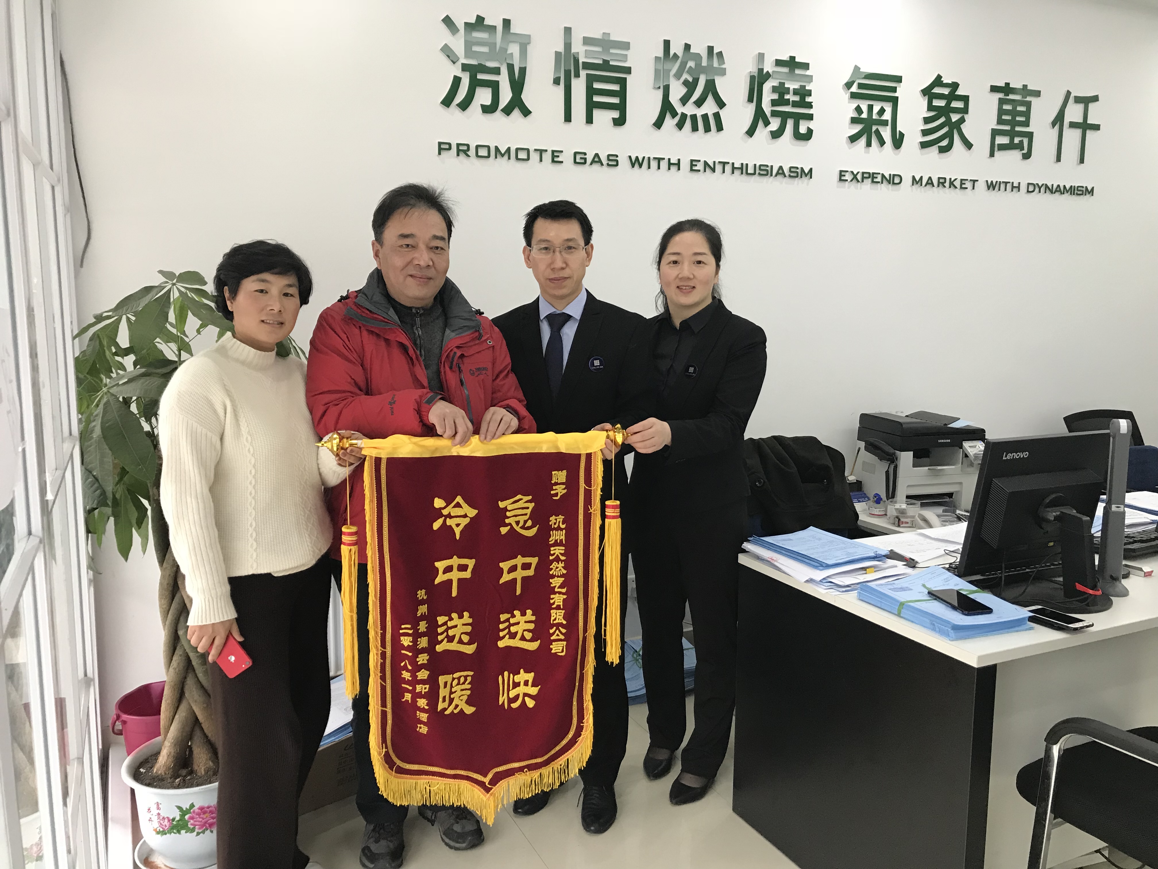 1月4日下午,杭州景澜·云台印象酒店送来了一面印有“急中送快 冷中送暖”的锦旗,对滨江分公司非居民“一站式”热忱、高效的服务表示感谢。