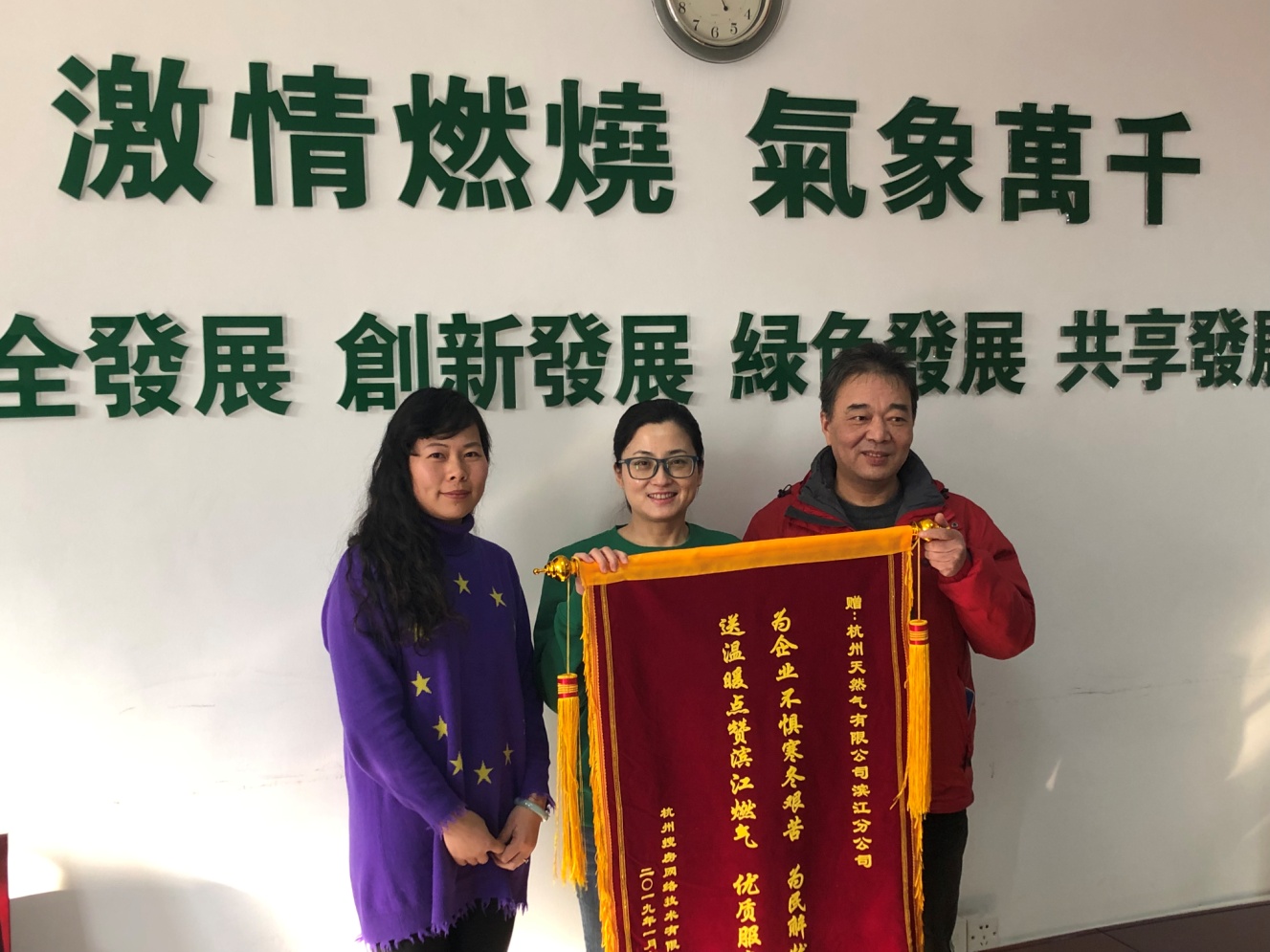 1月21日下午,搜房网软件开发基地项目负责人吴薇女士向滨江分公司送上写有“为企业不惧寒冬艰苦,为民解忧;送温暖点赞滨江燃气,优质服务”的锦旗。
