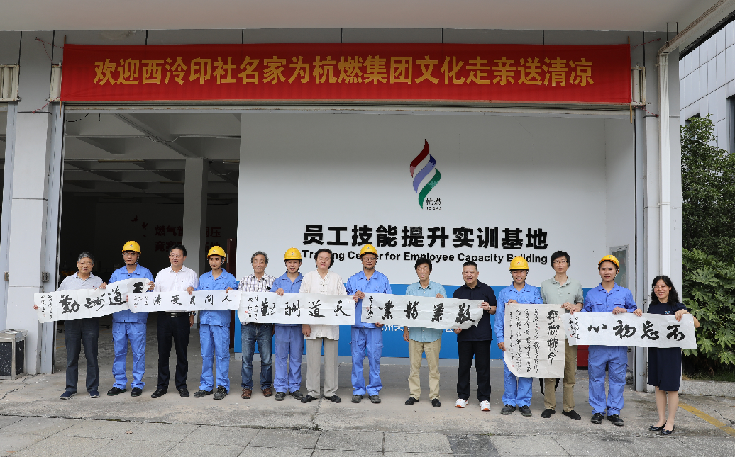 9月2日上午,宋涛、杨西湖、沈金加、吴新如、夏一鹏、郭超英西泠印社书法家一行6人走进七堡基地“沈卫国技能大师工作室”开展“杭燃文化走亲送清凉”活动。集团领导芦俊、朱琴君,集团办公室、杭天公司相关负责人、一线优秀员工代表沈卫国、钟奇、丁荣荣、赖涛、范列朋、陈全良参加。