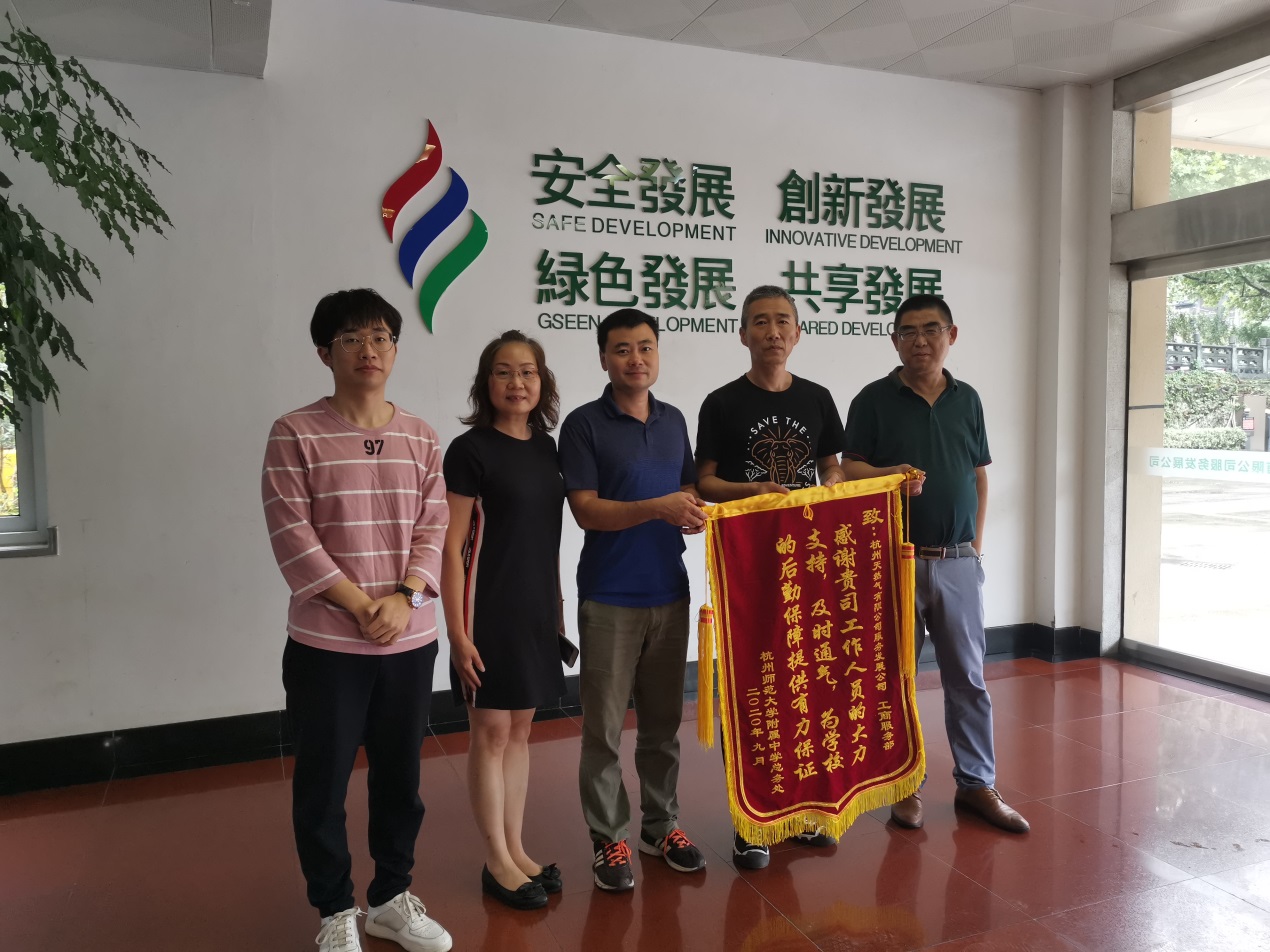 9月16日上午,杭州师范大学附属中学总务处专程将一面上书“感谢贵司工作人员的大力支持,及时通气,为学校的后勤保障提供有力保证”的锦旗送至服务发展公司,真诚感谢公司在拆改工作中为其提供的优质服务,赞扬拆改工程的高效有序。