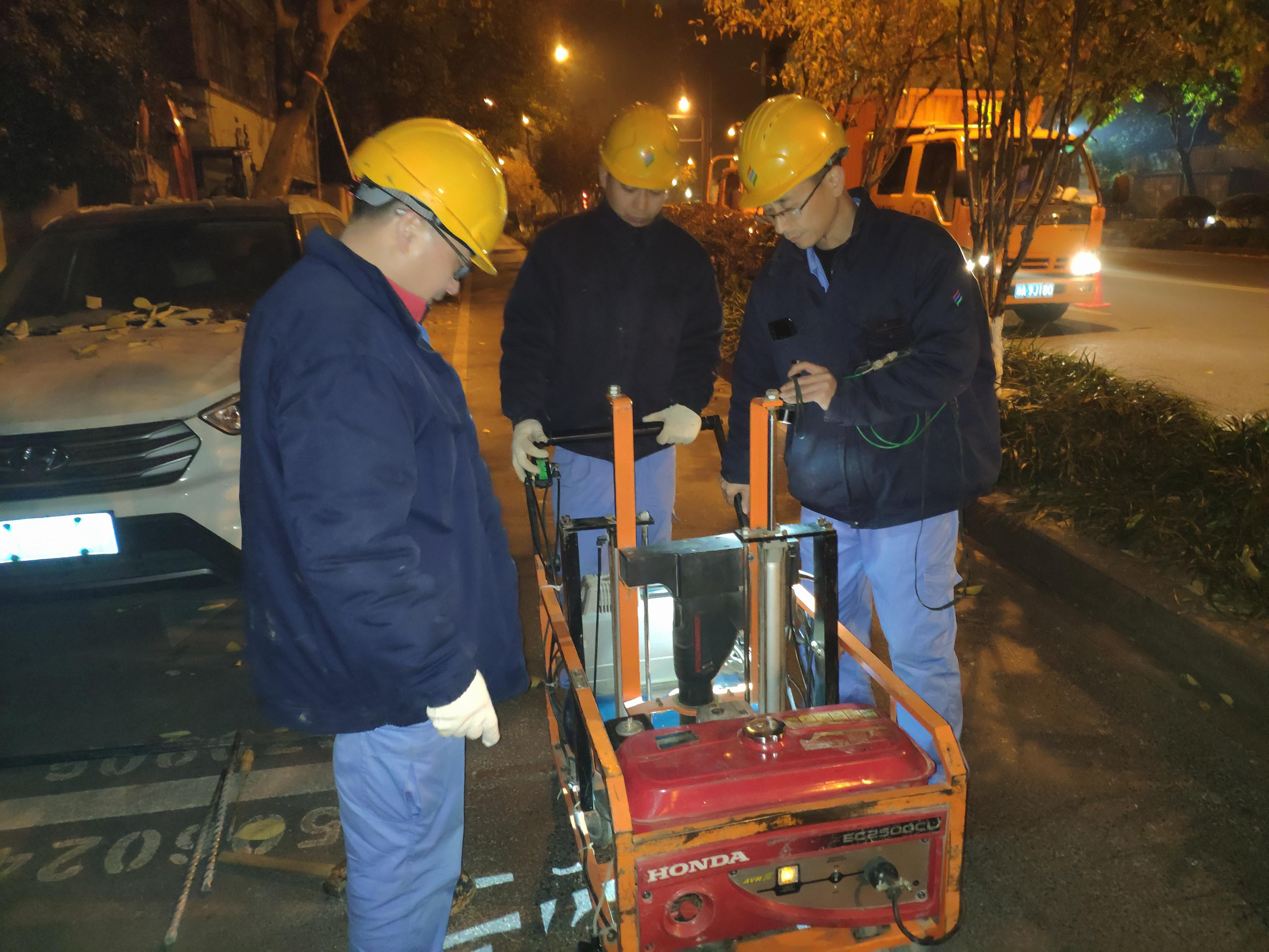管网输配分公司天目运行管理站运行组长胡永明带队到达现场后,发现地表检测泄露点距离实际管位较远,且浓度最高处有一株高约10米的大树,确定管道实际泄露位置成了抢修中的最大考验,抢修组利用激光检漏仪沿管位全面地毯式核查,并对每个管线单位井内查漏,然收效甚微。于是另辟蹊径利用钻孔机沿着管位每隔1-2米进行钻孔查漏,在不影响交通的情况下,对泄露最高处开挖检查,一天一夜过去后仍无结果。另一组人员紧随其后,终于在10日夜间确定为横穿管DN200套筒接口处轻微泄露,并于11日凌晨3点完成修复。期间,天目站站长钟奇一直驻守现场,集团综合管理部经理陈建、分公司副经理沈洪定也前往抢修现场指导。