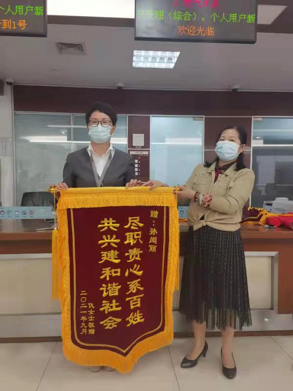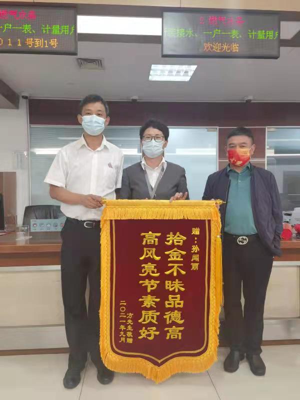 10月11日上午,用户方先生和仇女士来到市民中心燃气窗口,送上了两面锦旗,分别上书“拾金不昧品德高,高风亮节素质好”和“尽职责心系百姓,共兴建和谐社会”,以感谢客服员孙闻丽拾金不昧的品质及耐心细致的服务态度。