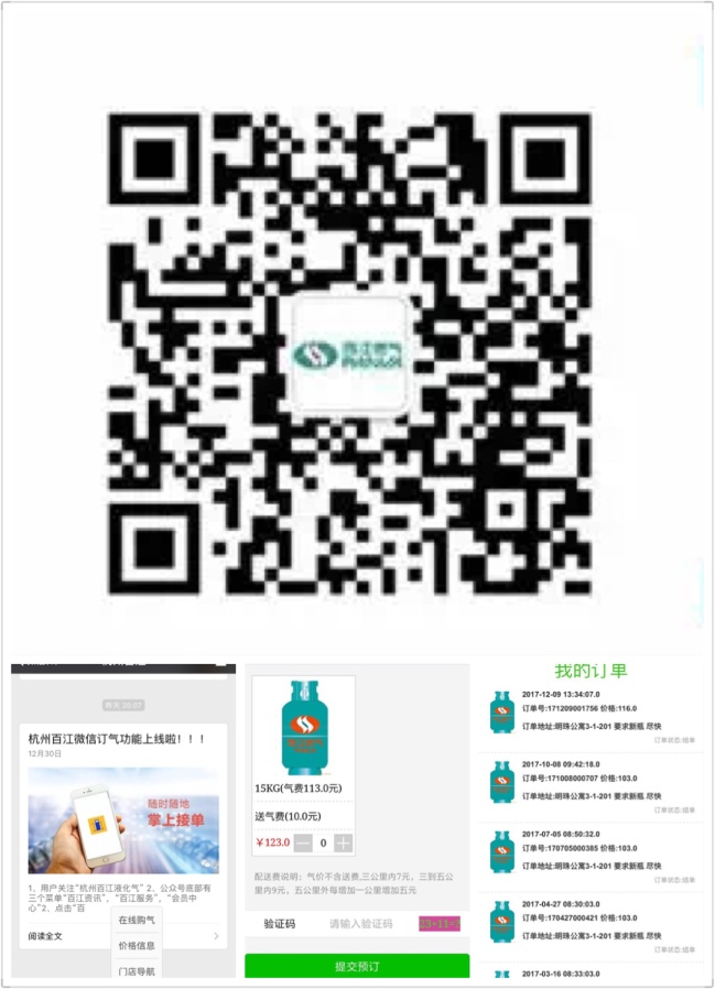 用户可通过微信关注杭州百江公众号“杭州百江液化气”,在完成客户信息绑定(绑定磁卡号码、送气地址、联系方式等)后,点击“百江服务”板块中的“在线购气”选项,核对送气地址及联系方式,选择瓶型及数量即可进行在线购气。为保证微信订气系统的稳定运行,公司不仅对客服人员进行了专职培训,更向各管理人员进行了微信订气系统的后台维护基本知识培训,确保每一位用户都可顺利订气。