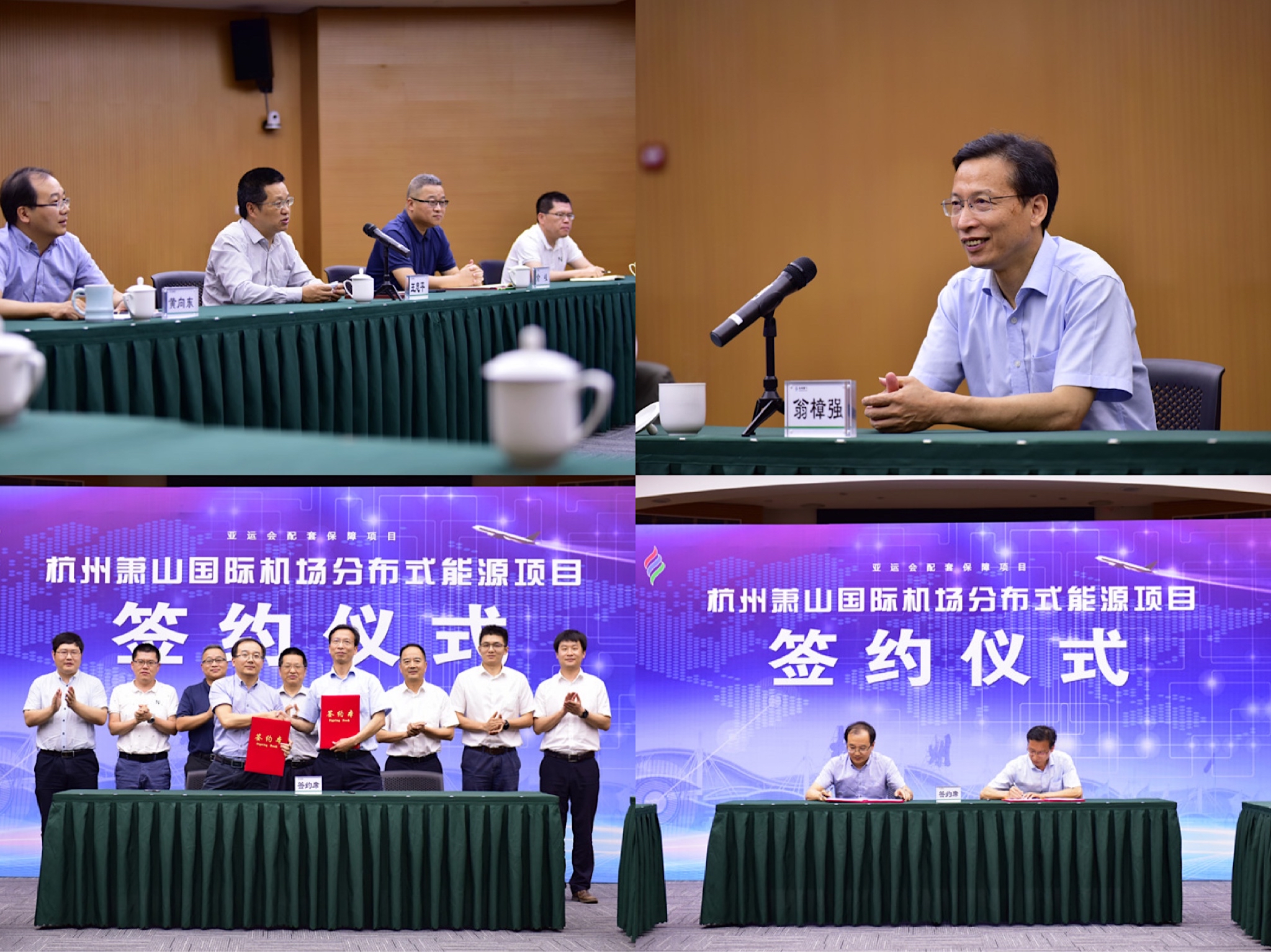 2020年6月5日上午,杭州萧山国际机场有限公司、杭州城市能源有限公司在小和山绿色能源体验中心举行杭州萧山国际机场分布式能源项目签约仪式。杭州萧山国际机场三期建设指挥部副书记、副总指挥翁樟强,欧美成人视频 有限公司党委委员、副总经理王忠平、俞峻,杭州萧山国际机场三期建设指挥部工程二部、设计技术部负责人,杭州城市能源公司领导班子参加了签约仪式。