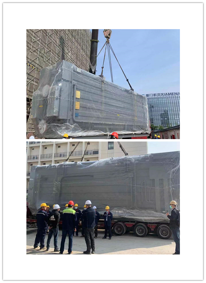 16日上午8点58分随着一声洪亮的口令,200吨大型吊机的轰鸣声响起,溴化锂机组设备开始正式吊装。在能源公司现场总负责的指挥下,重达48吨的溴化锂机组主体缓缓升起,在空中完成转向等动作后缓缓落入指定滑轨中,落入滑轨后现场负责人迅速检查外观有无破损,滑轨功能是否完好,设备重心是否符合要求。在完成上述工作后,随着卷扬机的启动,溴化锂机组缓慢转向,设备一步步滑入现场,现场人员齐心协力,历时2天顺利完成吊装就位。