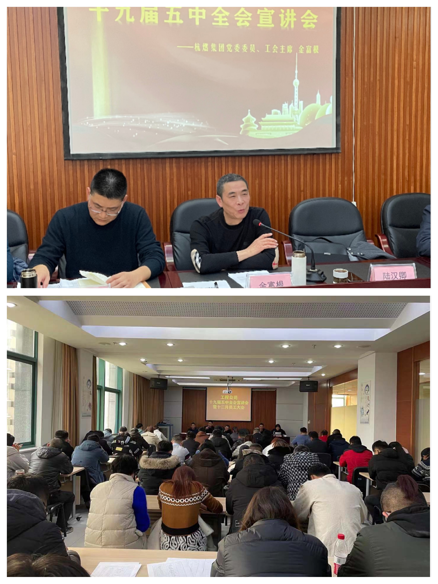 金主席紧扣习近平总书记在党的十九届五中全会上的重要讲话和全会审议通过的规划《建议》,重点围绕深刻认识我国进入新发展阶段的重大意义、有利条件和重要特征,准确把握2035年远景目标和“十四五”时期我国发展的指导方针、主要目标、重点任务,牢牢把握构建新发展格局的战略构想和重要着力点,坚持党的全面领导、动员各方面力量团结奋斗等方面,结合集团公司创建健康企业的过程和取得的成绩等事例,进行了全面宣讲和深入阐释。金主席指出,要深刻领会全会精神的核心要义,准确把握新发展阶段,坚定贯彻新发展理念,积极融入新发展格局;要把学习贯彻五中全会精神与企业发展更加紧密结合起来,切实围绕集团“十四五”规划“1238”发展总领,准确落实好工程公司“11369”“十四五”规划;要坚持理论联系实际确保学习实效,切实把学习贯彻全会精神焕发出的热情和干劲,转化为冲刺年度工作目标的实际行动,为“十三五”圆满收官和“十四五”开好局、起好步奠定坚实基础。