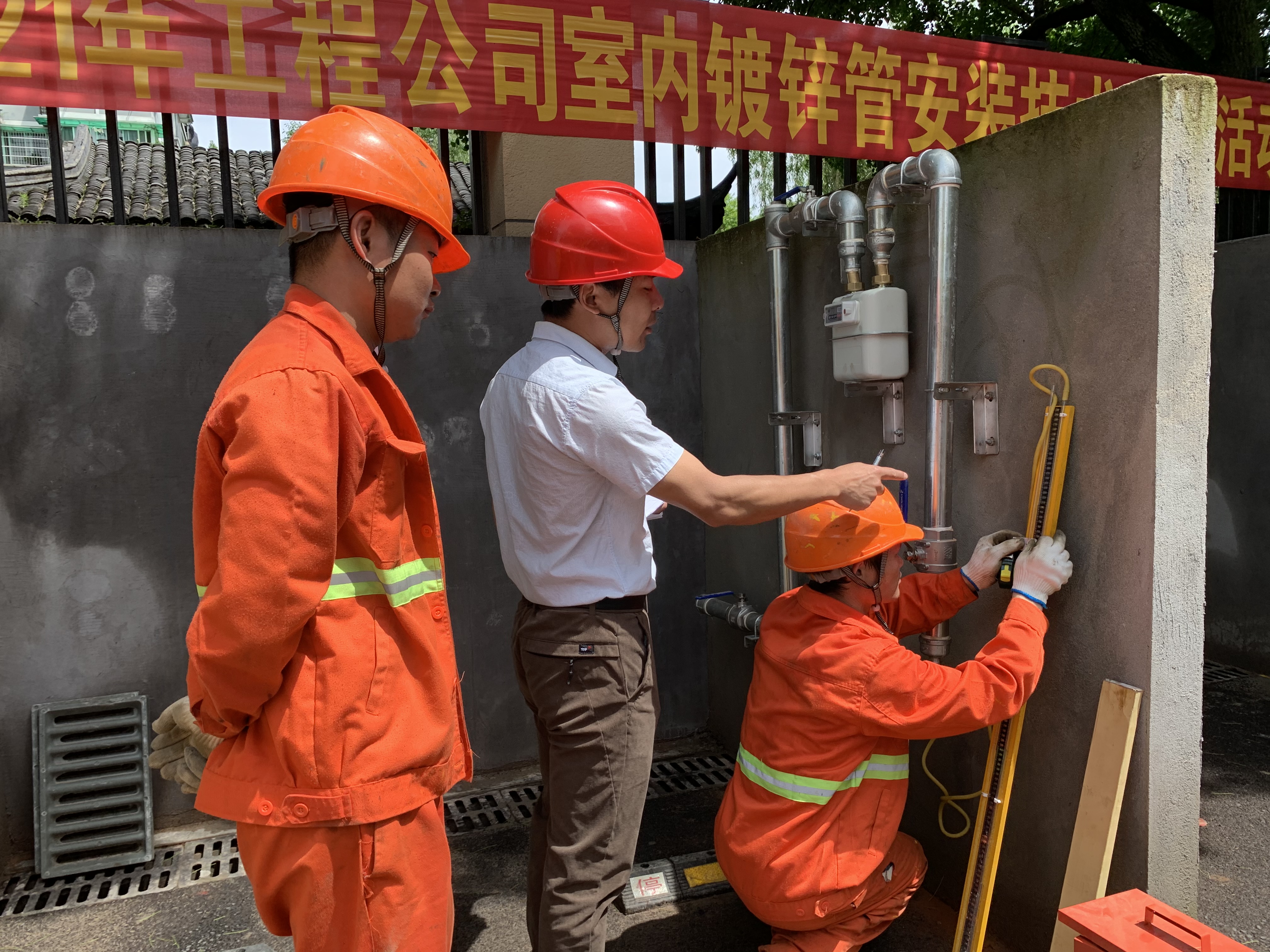 此次比武项目分为两类,主要考验施工员对螺纹加工、管道施工、燃气表安装、气密测试等步骤的实操能力。参赛选手两人一组,以抽签的方式分为8批,每批2支队伍,分别对应两项不同要求。“比武时间为一个小时,大家在追求速度的同时切记要确保安装规范、美观和气密性合格!”规则和注意事项宣布完成后,比武正式拉开帷幕。切割、碰接、装表、检测……时间紧凑,环环相扣,队员相互协作,默契配合。前一日的强降雨过后气温上升,天气闷热,汗水浸湿了工装,但选手们依旧戒骄戒躁,稳扎稳打,又好又快完成每道工序。