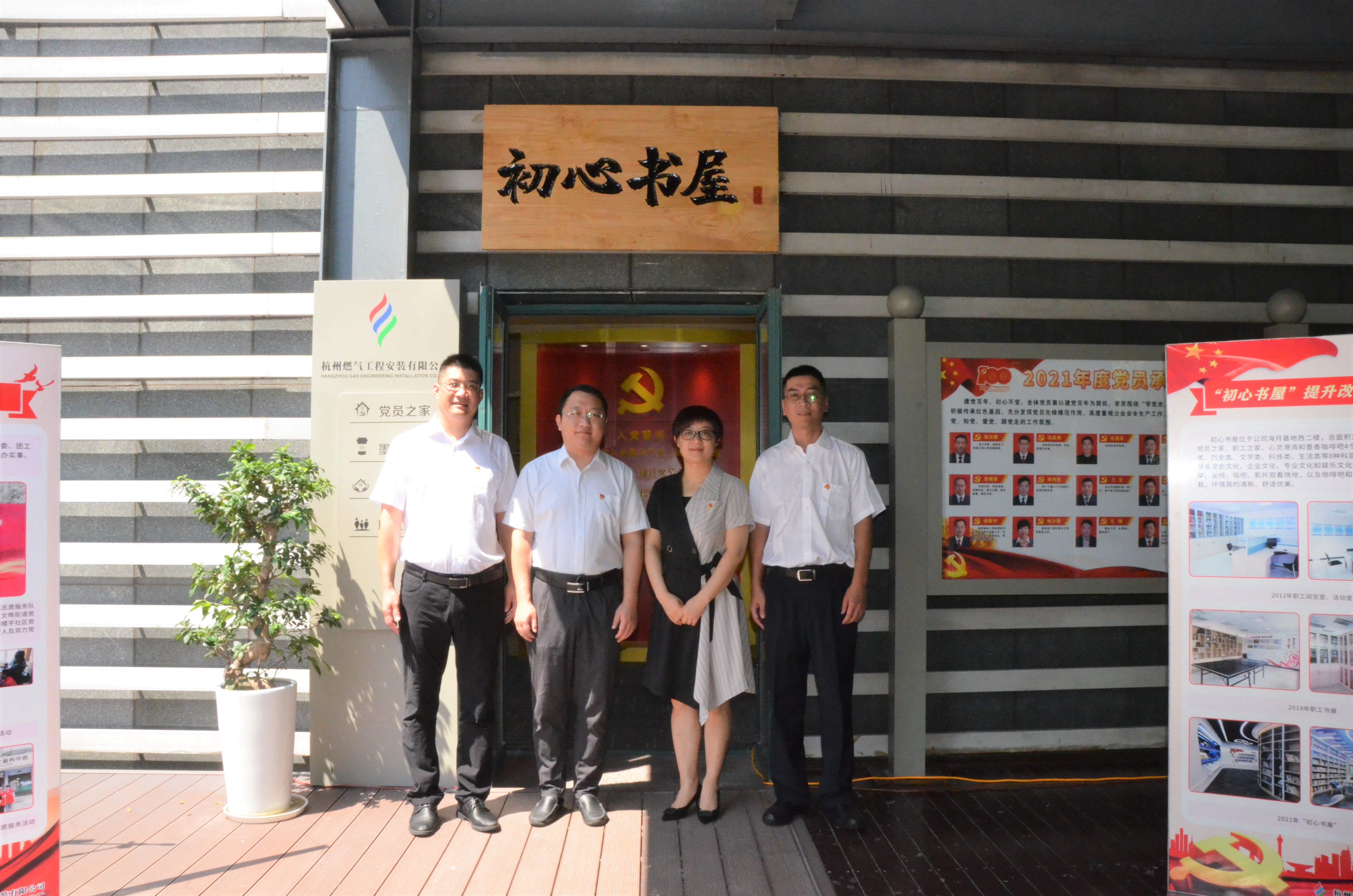 文晖街道党工委副书记朱斌,两新工委委员、江南楼宇社区党委书记田红卫,工程公司党支部书记、总经理冯其栋,党支部副书记、副总经理朱国军共同为“初心书屋”揭牌;并与全体党员重温入党誓词。发布会后,全体人员还一同参观“初心书屋”,写下初心寄语、分享书籍、品味咖啡。