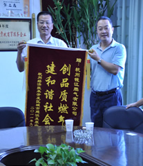 9月6日上午,杭州经济技术开发区城市建设开发中心主任郝大龙一行,莅临杭州钱江燃气有限公司指导工作,并赠予题写"创品质燃气,建和谐社会"锦旗一面.