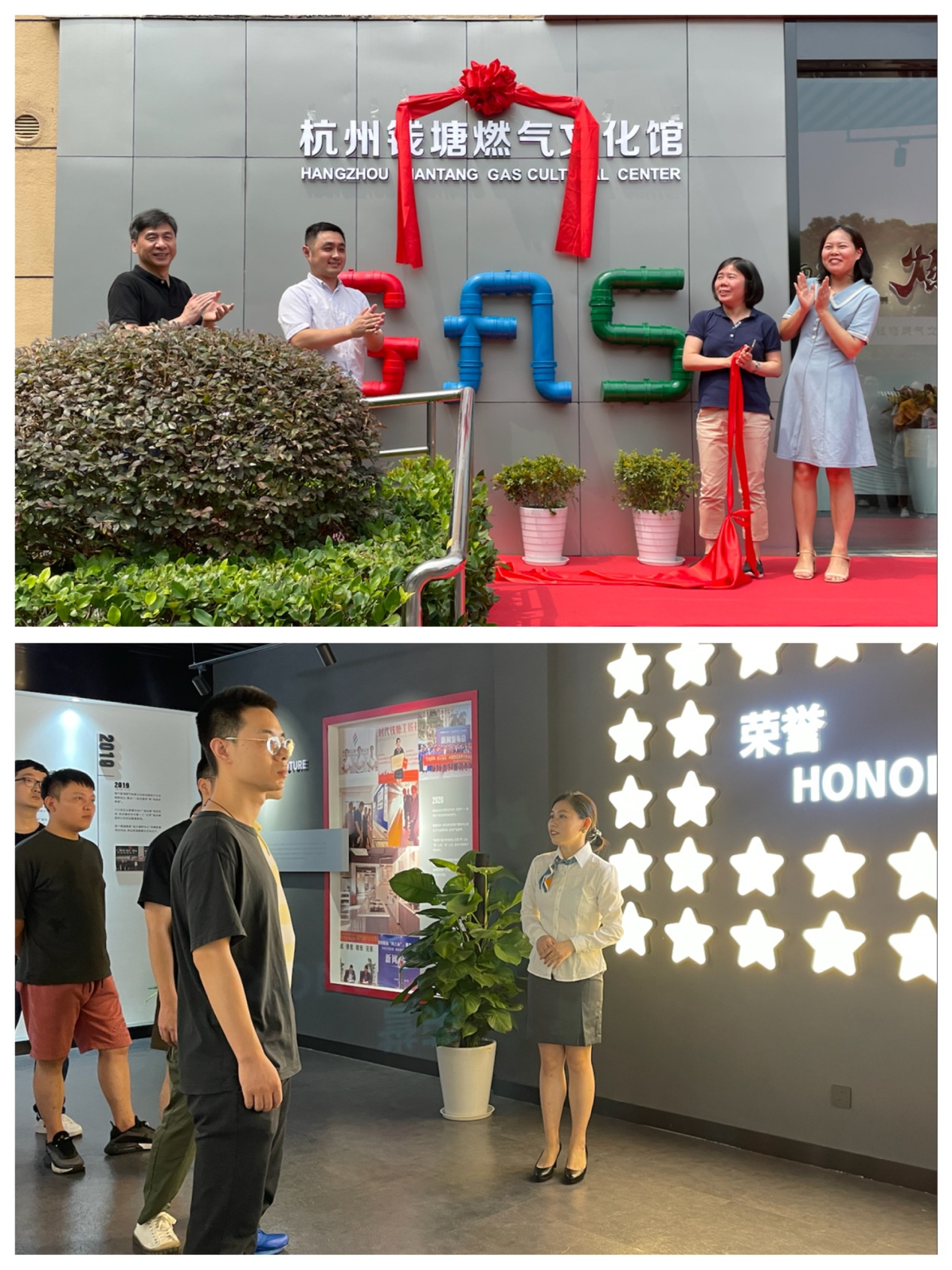 8月26日上午,钱江公司举行杭州钱塘燃气文化馆开馆仪式,欧美成人视频 党委委员、纪委书记赵伟儿、钱江公司总经理苏忠杰、副总经理俞勤峰、何香共同揭牌,各部门负责人、职工代表齐聚揭牌仪式现场,共同见证这一激动人心的时刻。杭州一台、杭州二台、杭州日报、钱江晚报、杭州网、钱塘新区报应邀参加。揭牌仪式结束,公司技能大师领衔人殷一珍带领媒体朋友及新员工进行参观。