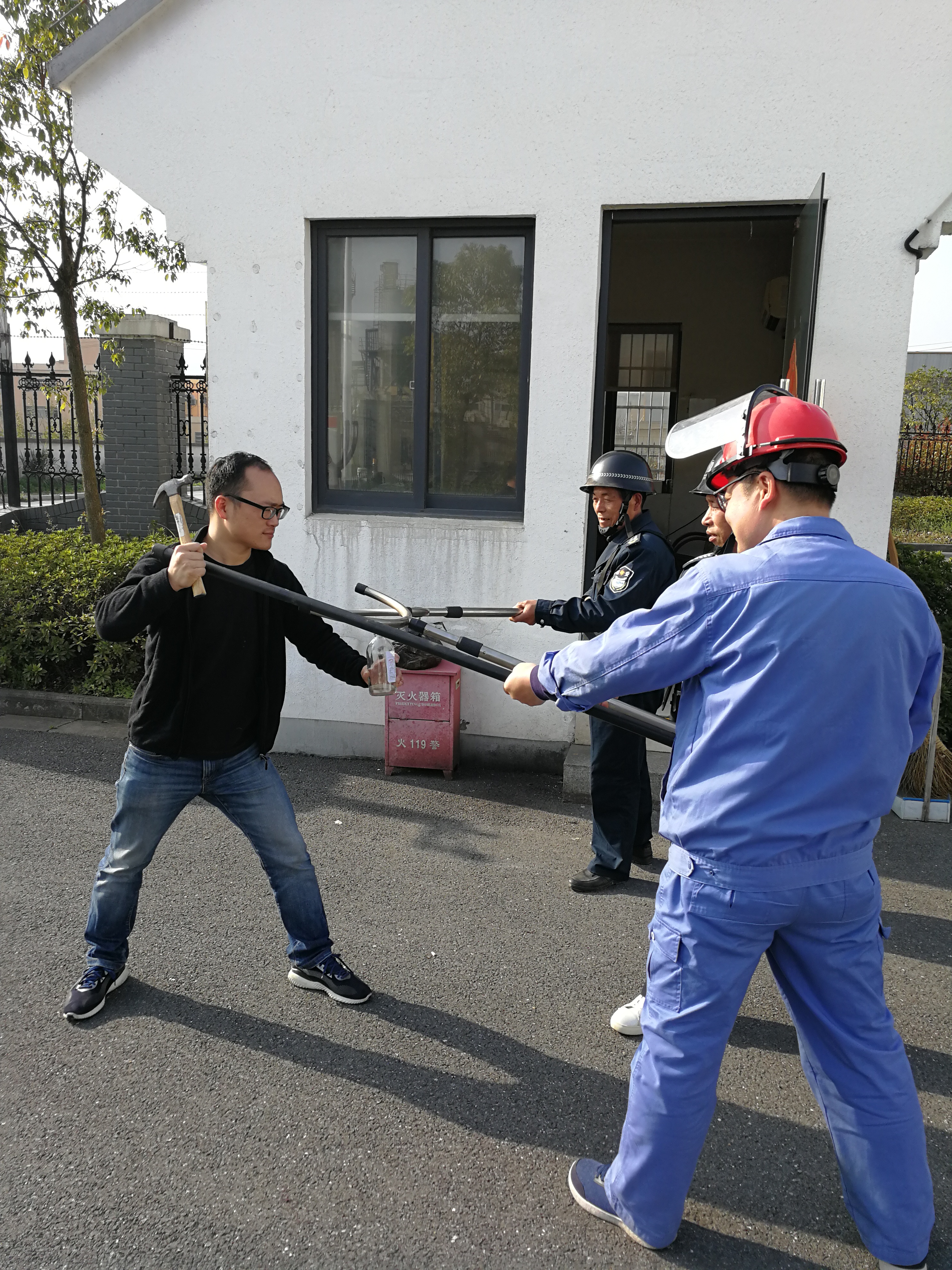 2019年3月20日上午10时,一名 “歹徒”,手持凶器强行闯入场站(本站员工扮演行凶歹徒)。场站值班门卫带着警棍马上前去劝其停下并让他离开场站,该男子不听劝告继续往办公楼内闯。值班人员看到此情况,立即向部门负责人报告,同时启动了《桐庐江南LNG应急气源站反恐防暴应急预案》,组织应急人员并手持防暴器械赶往现场进行阻拦。经过近5分钟的搏斗,大家将“歹徒”成功制服。