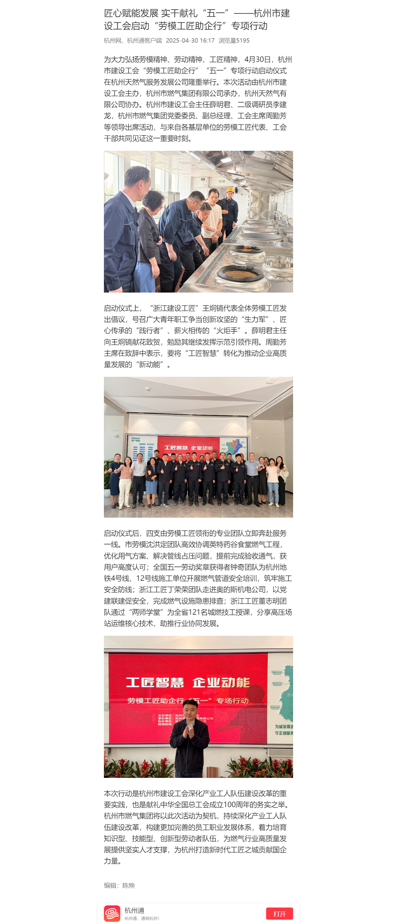 为大力弘扬劳模精神、劳动精神、工匠精神,4月30日,杭州市建设工会“劳模工匠助企行”“五一”专项行动启动仪式在杭州天然气服务发展公司隆重举行。本次活动由杭州市建设工会主办,欧美成人视频 有限公司承办,杭州天然气有限公司协办。杭州市建设工会主任薛明君、二级调研员李建龙,欧美成人视频 党委委员、副总经理、工会主席周勤芳等领导出席活动,与来自各基层单位的劳模工匠代表、工会干部共同见证这一重要时刻。