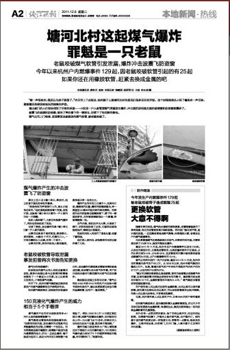 截至2011年11月底,杭州市区户内燃爆事件已发生129起。从发生的原因分析,主要是皮管使用、灶具质量和使用不当造成,占的比例分别为42%、32%和8.5%,在皮管使用问题中被老鼠咬破造成燃爆的为25起,占户内燃爆事件的19.4%。
