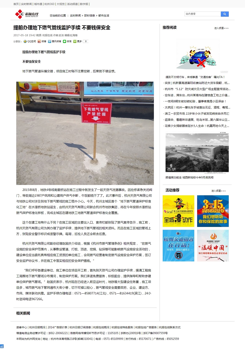 “我们呼吁各建设单位、施工单位在项目开工前,首先到天然气公司办理监护手续,摸清工程施工周围地下燃气管线分布情况,制定保护方案。我们承诺免费服务,积极配合,提供指导和帮助参建单位保护燃气管线。”赵国庆表示,杭州现在已经进入前亚运时代,地铁等大型建设任务重,施工项目多,城市燃气地下管网遍布大街小巷,切不可掉以轻心,燃气管线安全需要政府、企业、建设方、市民、媒体联动共推。监护手续办理电话:0571—85807714(江北),0571—81634419(滨江),24小时咨询电话967266。