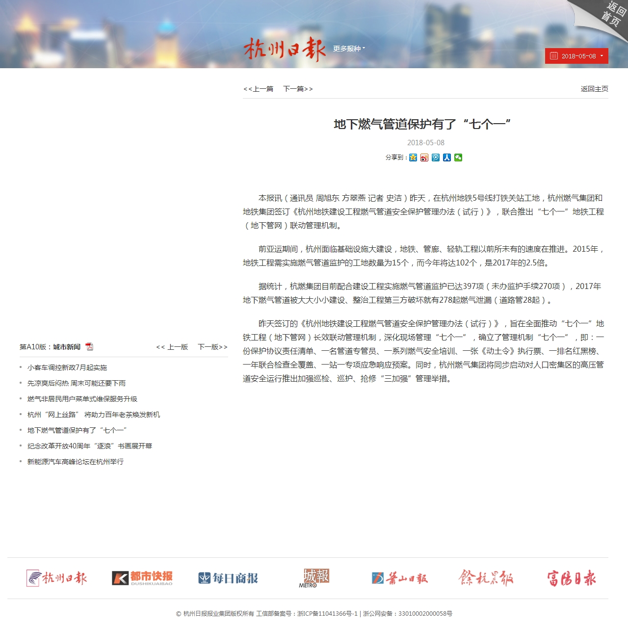 和地铁集团签订《杭州地铁建设工程燃气管道安全保护管理办法(试行)》,联合推出“七个一”地铁工程(地下管网)联动管理机制。