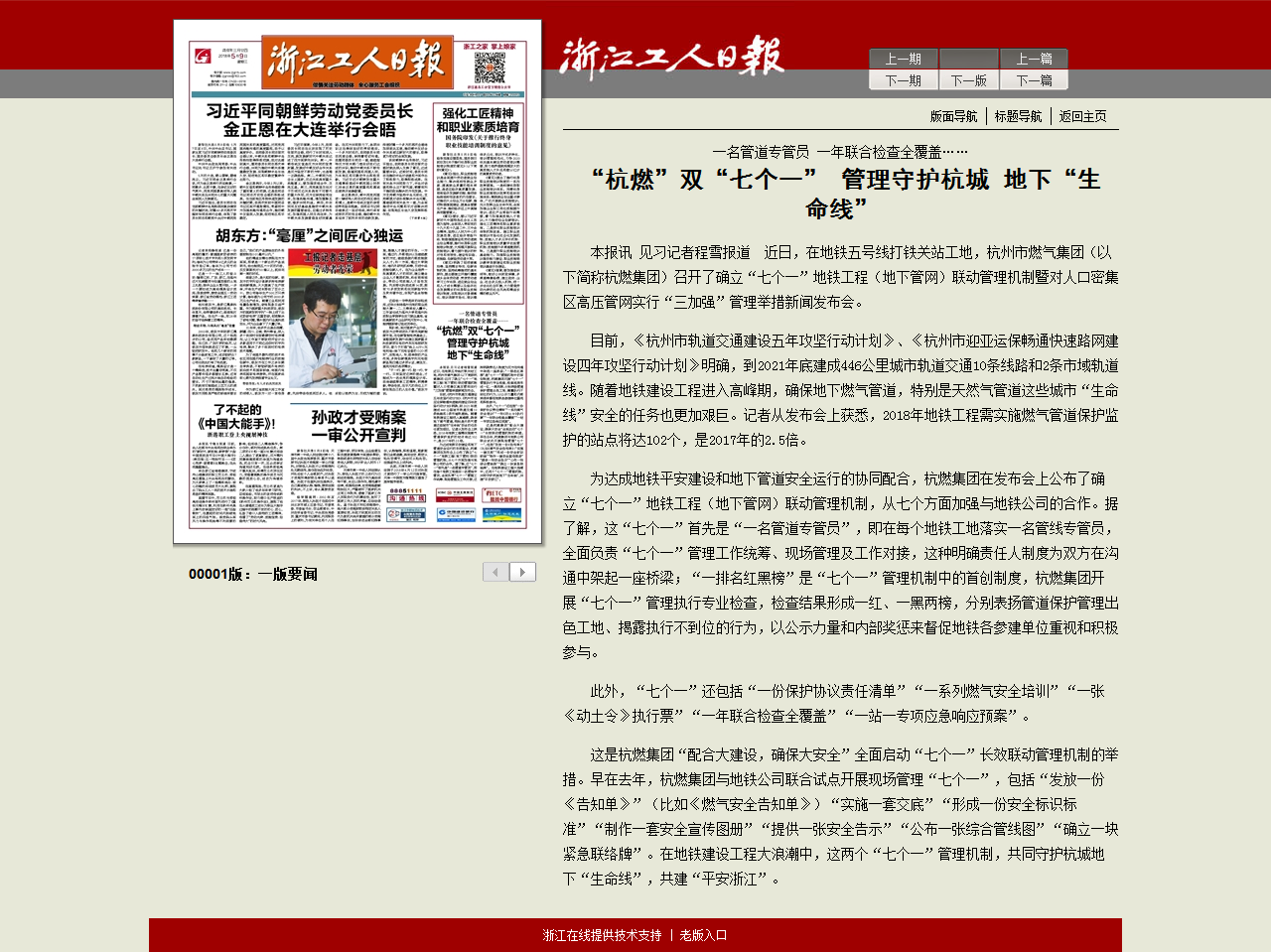 这是欧美成人视频 “配合大建设,确保大安全”全面启动“七个一”长效联动管理机制的举措。早在去年,欧美成人视频 与地铁公司联合试点开展现场管理“七个一”,包括“发放一份《告知单》”(比如《燃气安全告知单》)“实施一套交底”“形成一份安全标识标准”“制作一套安全宣传图册”“提供一张安全告示”“公布一张综合管线图”“确立一块紧急联络牌”。在地铁建设工程大浪潮中,这两个“七个一”管理机制,共同守护杭城地下“生命线”,共建“平安浙江”。