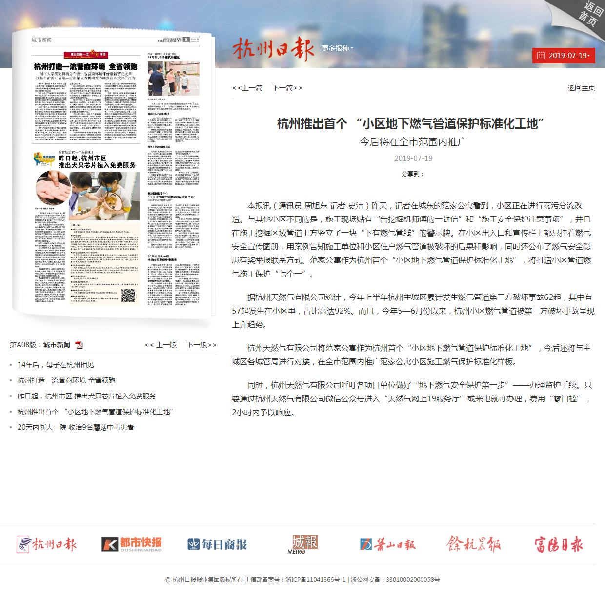 杭州天然气有限公司将范家公寓作为杭州首个“小区地下燃气管道保护标准化工地”,今后还将与主城区各城管局进行对接,在全市范围内推广范家公寓小区施工燃气保护标准化样板。