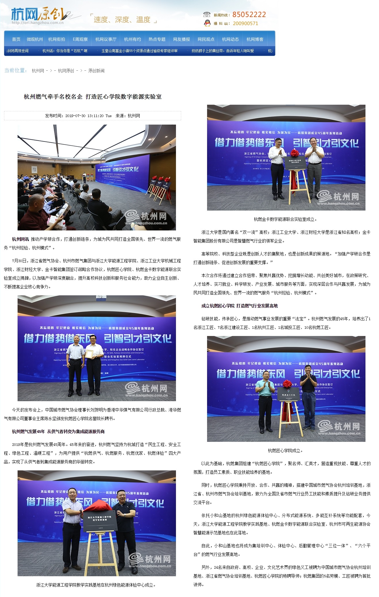 7月30日,浙江省燃气协会、欧美成人视频 与浙江大学能源工程学院、浙江工业大学机械工程学院、浙江财经大学、金卡智能集团签订战略合作协议,杭燃匠心学院、杭燃金卡数字能源联合实验室成立揭牌,以加强产学研深度融合,提升高校科技创新和服务社会能力,助力企业自主创新、不断提高企业核心竞争力。