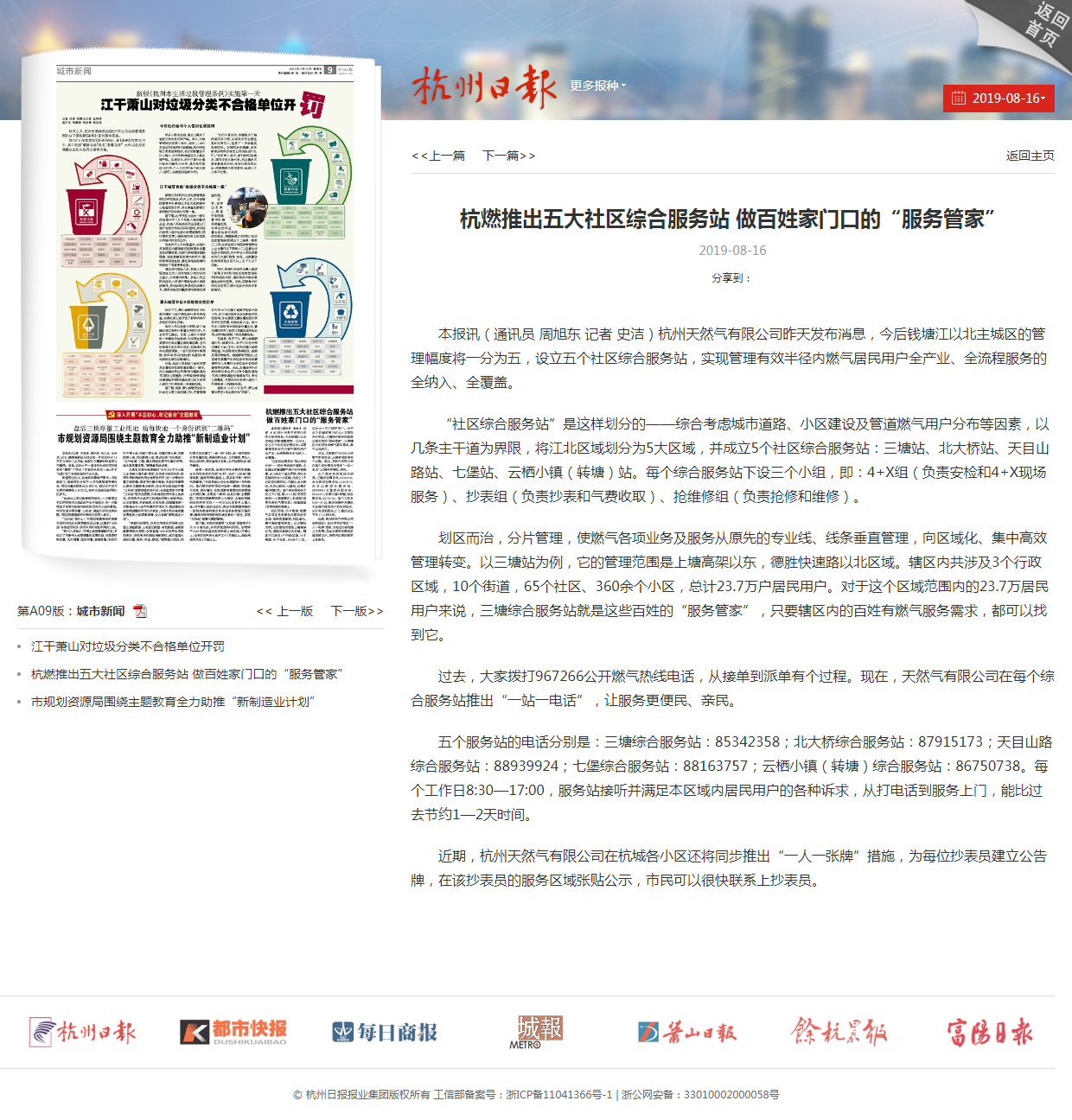 本报讯(通讯员 周旭东 记者 史洁)杭州天然气有限公司昨天发布消息,今后钱塘江以北主城区的管理幅度将一分为五,设立五个社区综合服务站,实现管理有效半径内燃气居民用户全产业、全流程服务的全纳入、全覆盖。