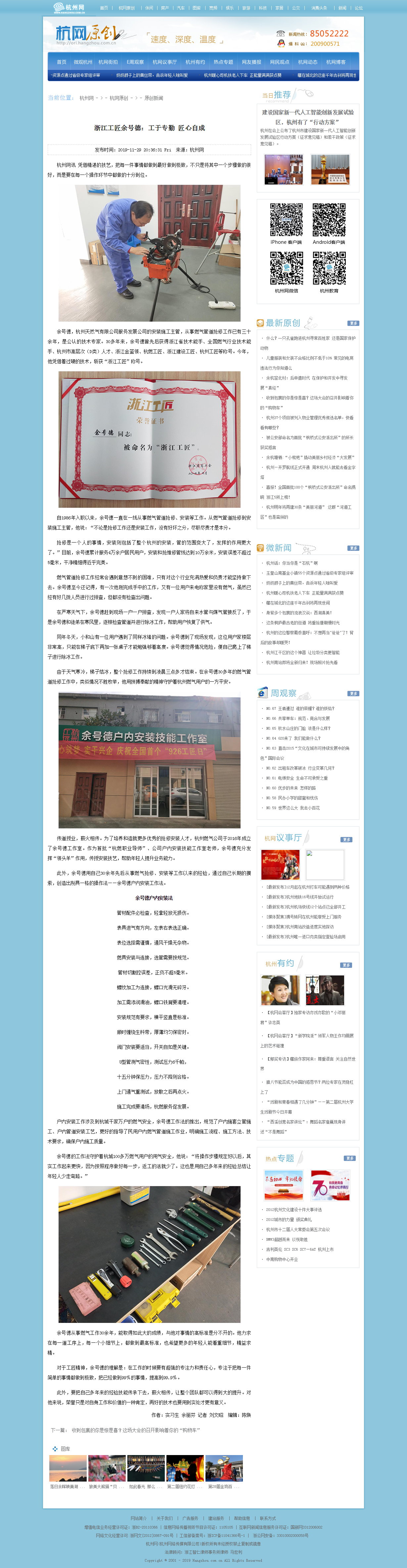 抢修是一个人的事情,安装则包括了整个杭州的安装,管的范围变大了,发挥的作用更大了。”目前,余号德累计服务4万余户居民用户,安装和抢维修管线达到10万余米,安装误差不超过5毫米,干净精细得近乎完美。
