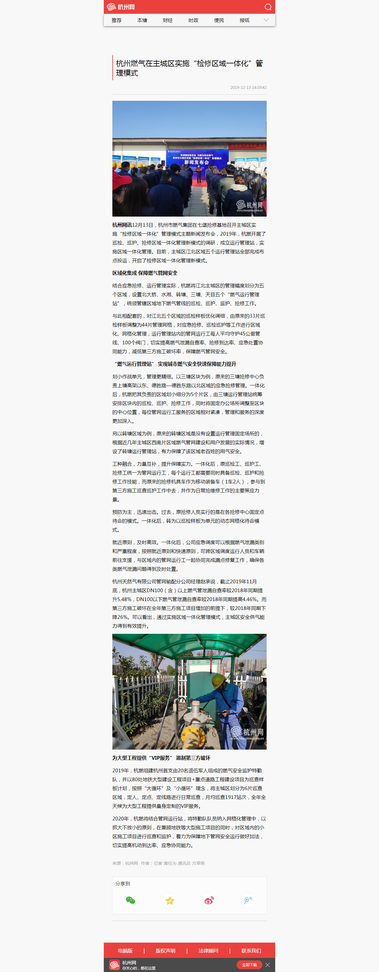 杭州网讯12月13日,欧美成人视频 在七堡抢修基地召开主城区实施“检修区域一体化”管理模式主题新闻发布会,2019年,杭燃开展了巡检、巡护、抢修区域一体化管理新模式的调研,成立运行管理站,实施区域一体化管理。目前,主城区江北区域五个运行管理站全部完成布点投运,开启了检修区域一体化管理新模式。