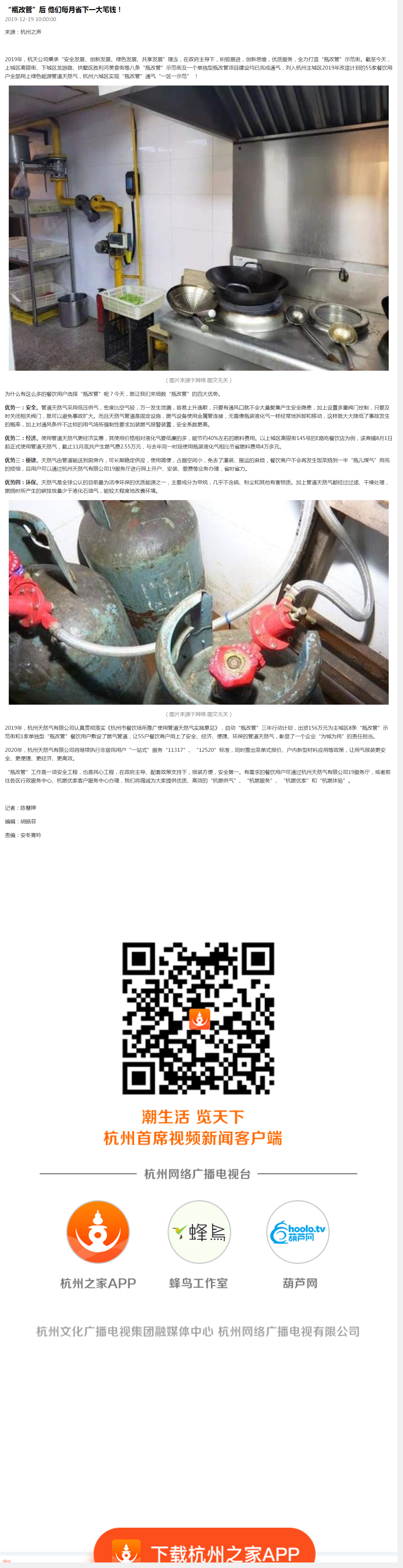 2019年,杭州天然气有限公司认真贯彻落实《杭州市餐饮场所推广使用管道天然气实施意见》,启动“瓶改管”三年行动计划,出资156万元为主城区8条“瓶改管”示范街和1家单独型“瓶改管”餐饮用户敷设了燃气管道,让55户餐饮商户用上了安全、经济、便捷、环保的管道天然气,彰显了一个企业“为城为民”的责任担当。