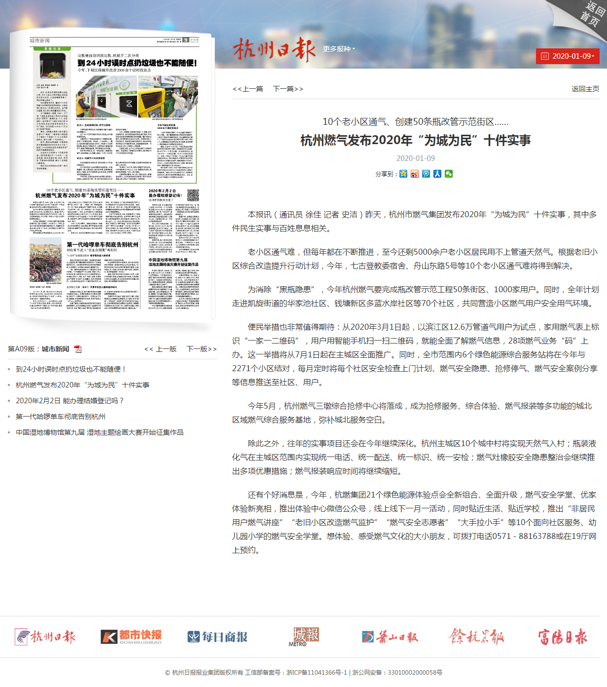 除此之外,往年的实事项目还会在今年继续深化。杭州主城区10个城中村将实现天然气入村;瓶装液化气在主城区范围内实现统一电话、统一配送、统一标识、统一安检;燃气灶橡胶安全隐患整治会继续推出多项优惠措施;燃气报装响应时间将继续缩短。