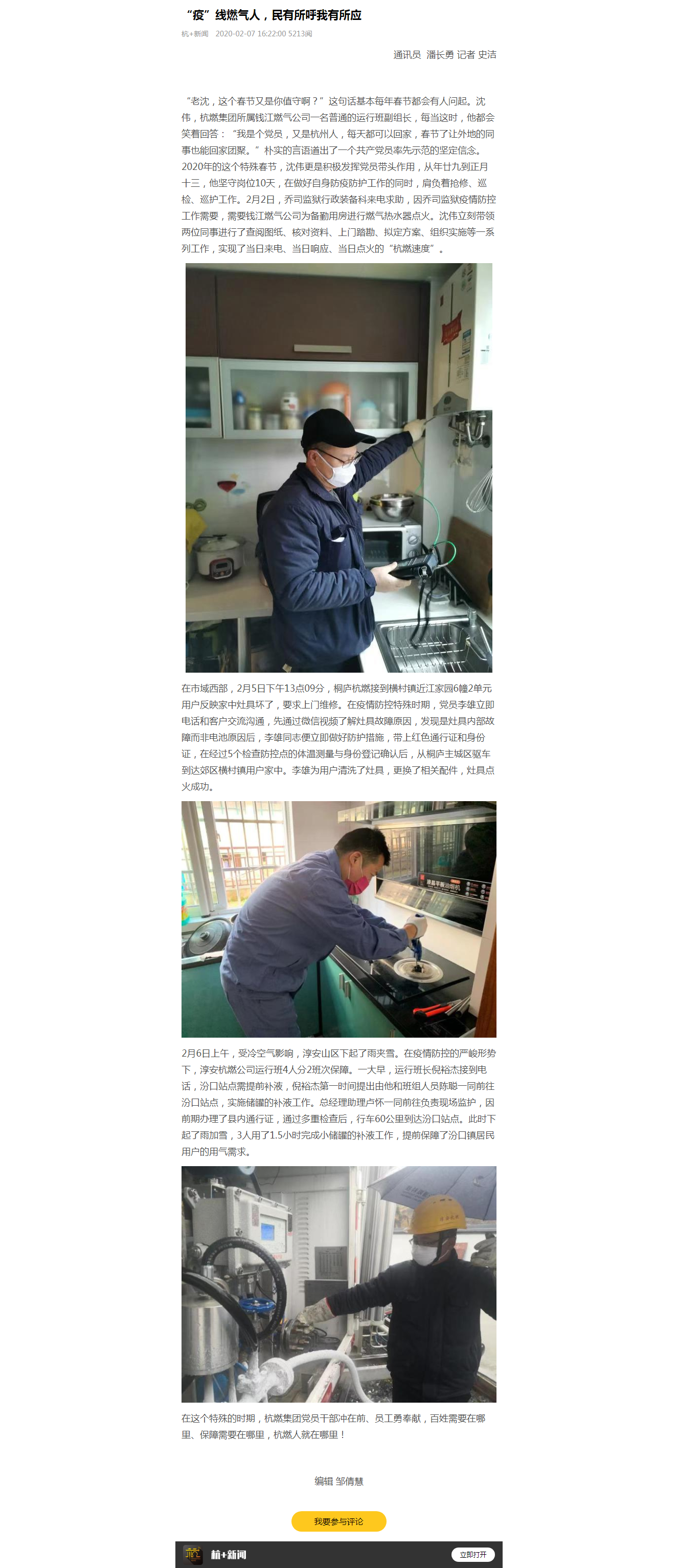 “老沈,这个春节又是你值守啊?”这句话基本每年春节都会有人问起。沈伟,欧美成人视频 所属钱江燃气公司一名普通的运行班副组长,每当这时,他都会笑着回答:“我是个党员,又是杭州人,每天都可以回家,春节了让外地的同事也能回家团聚。”朴实的言语道出了一个共产党员率先示范的坚定信念。2020年的这个特殊春节,沈伟更是积极发挥党员带头作用,从年廿九到正月十三,他坚守岗位10天,在做好自身防疫防护工作的同时,肩负着抢修、巡检、巡护工作。2月2日,乔司监狱行政装备科来电求助,因乔司监狱疫情防控工作需要,需要钱江燃气公司为备勤用房进行燃气热水器点火。沈伟立刻带领两位同事进行了查阅图纸、核对资料、上门踏勘、拟定方案、组织实施等一系列工作,实现了当日来电、当日响应、当日点火的“杭燃速度”。