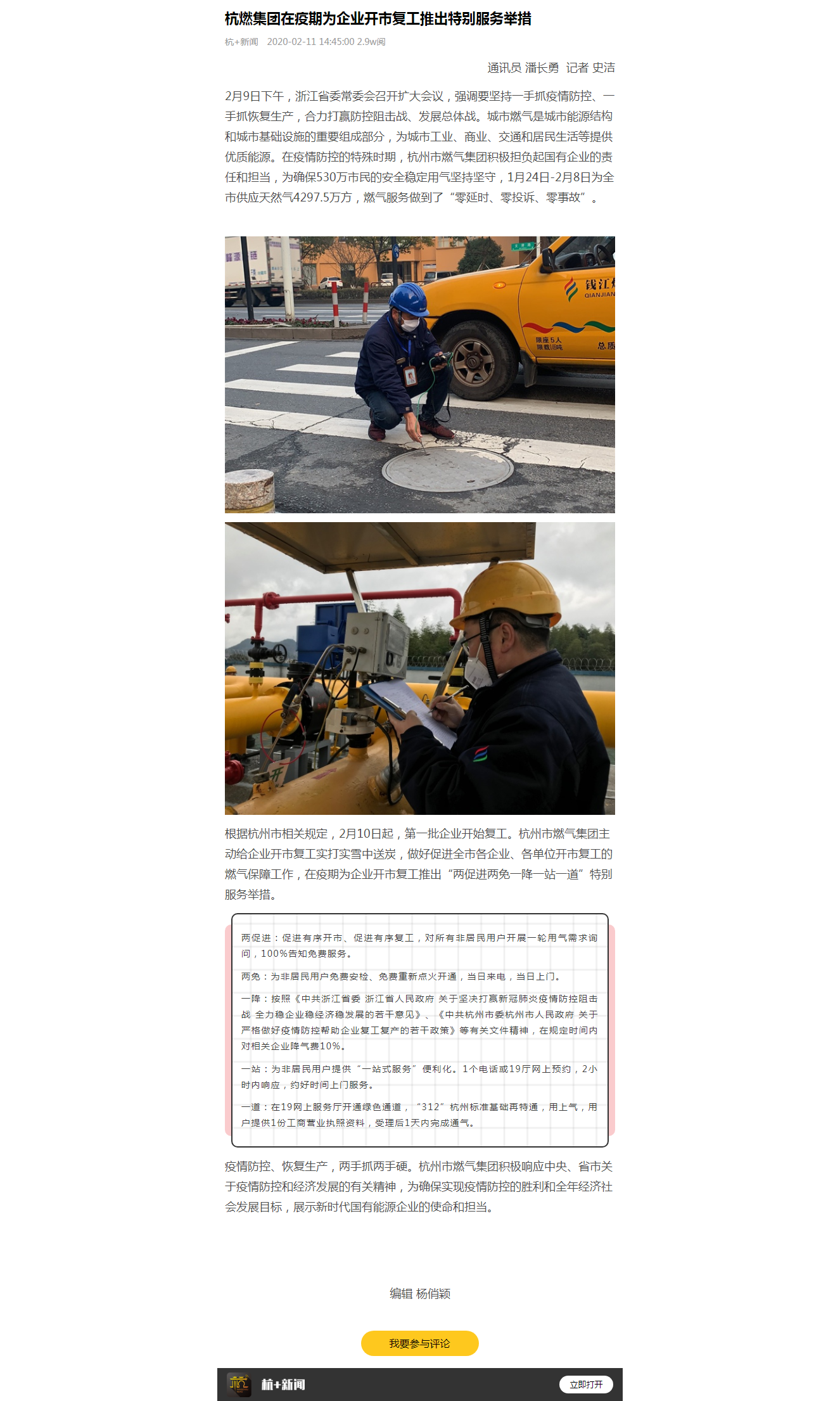 根据杭州市相关规定,2月10日起,第一批企业开始复工。欧美成人视频 主动给企业开市复工实打实雪中送炭,做好促进全市各企业、各单位开市复工的燃气保障工作,在疫期为企业开市复工推出“两促进两免一降一站一道”特别服务举措。