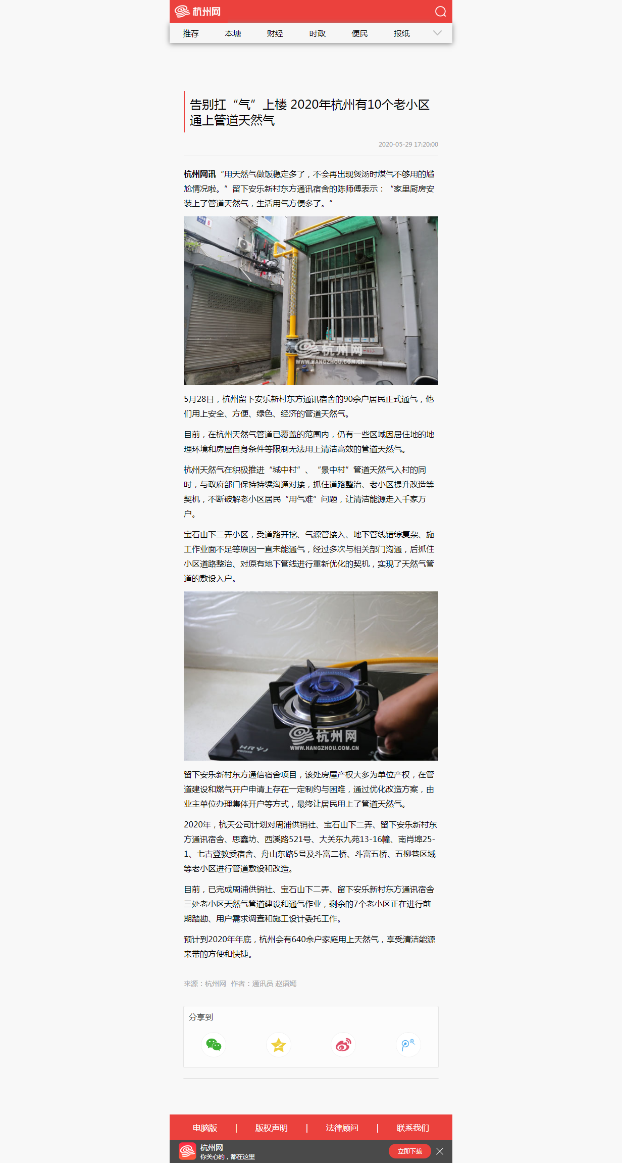 5月28日,杭州留下安乐新村东方通讯宿舍的90余户居民正式通气,他们用上安全、方便、绿色、经济的管道天然气。