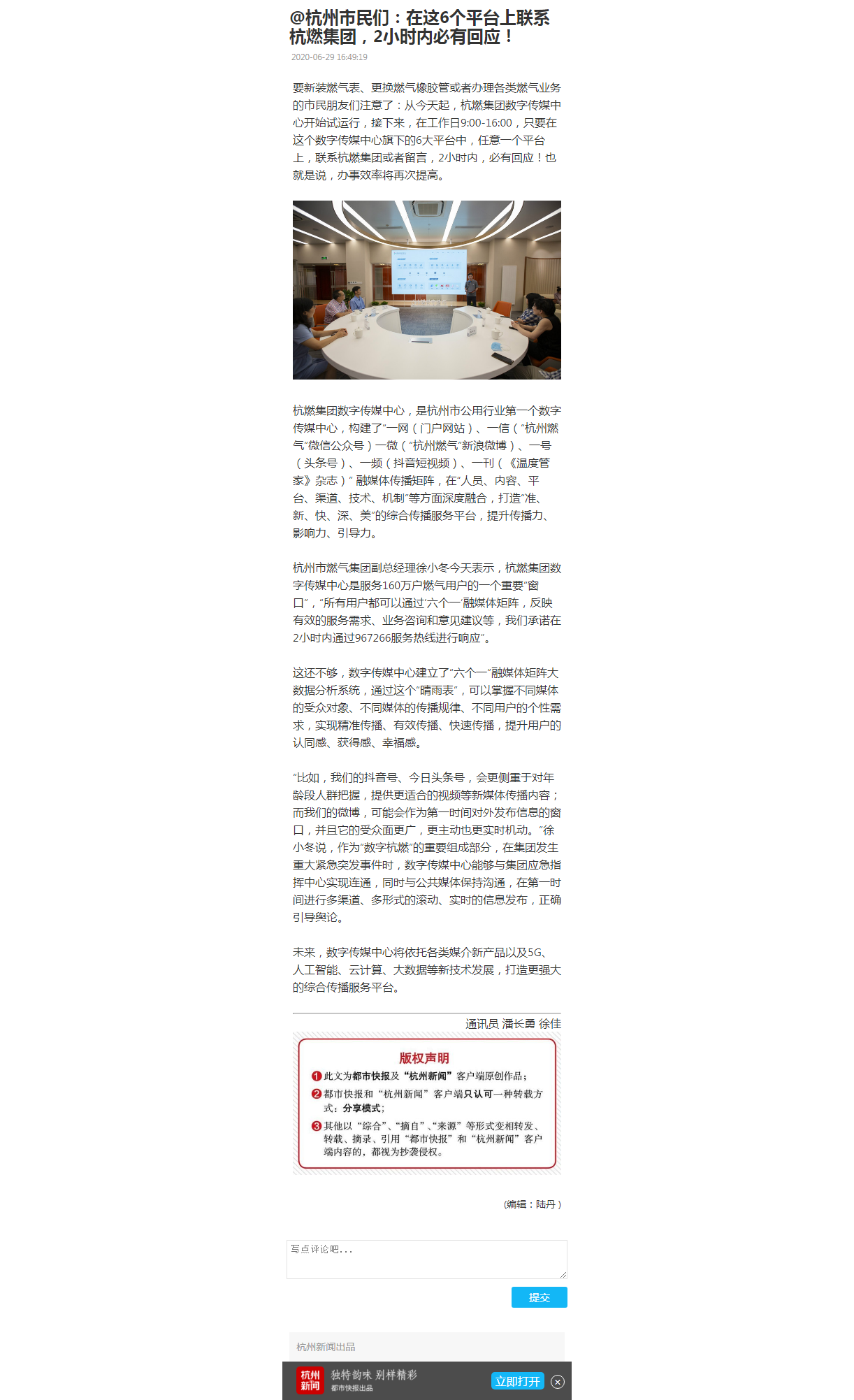 “比如,我们的抖音号、今日头条号,会更侧重于对年龄段人群把握,提供更适合的视频等新媒体传播内容;而我们的微博,可能会作为第一时间对外发布信息的窗口,并且它的受众面更广,更主动也更实时机动。”徐小冬说,作为“数字杭燃”的重要组成部分,在集团发生重大紧急突发事件时,数字传媒中心能够与集团应急指挥中心实现连通,同时与公共媒体保持沟通,在第一时间进行多渠道、多形式的滚动、实时的信息发布,正确引导舆论。