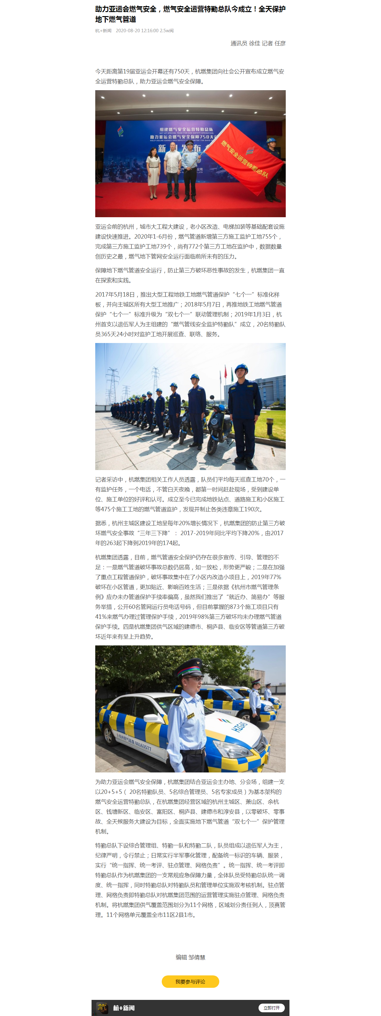 为助力亚运会燃气安全保障,欧美成人视频 结合亚运会主办地、分会场,组建一支以20+5+5( 20名特勤队员、5名综合管理员、5名专家成员)为基本架构的燃气安全运营特勤总队,在欧美成人视频 经营区域的杭州主城区、萧山区、余杭区、钱塘新区、临安区、富阳区、桐庐县、建德市和淳安县,以零破坏、零事故、全天候服务大建设为目标,全面实施地下燃气管道“双七个一”保护管理机制。