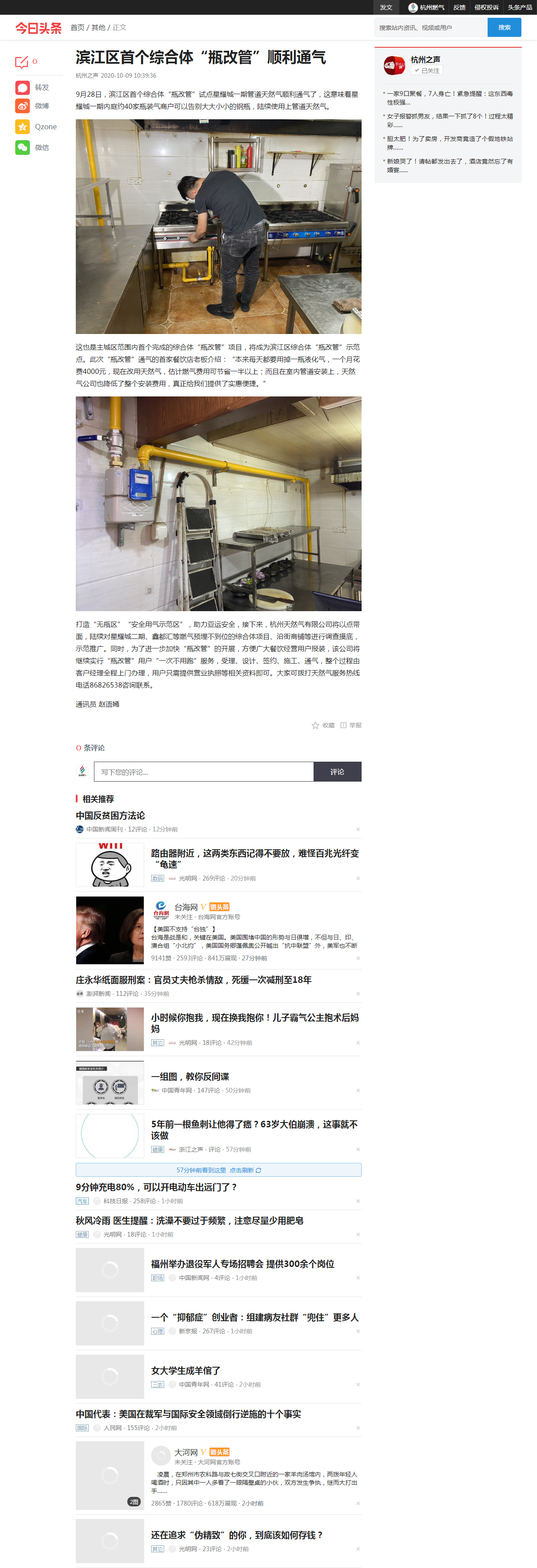 这也是主城区范围内首个完成的综合体“瓶改管”项目,将成为滨江区综合体“瓶改管”示范点。此次“瓶改管”通气的首家餐饮店老板介绍:“本来每天都要用掉一瓶液化气,一个月花费4000元,现在改用天然气,估计燃气费用可节省一半以上;而且在室内管道安装上,天然气公司也降低了整个安装费用,真正给我们提供了实惠便捷。”