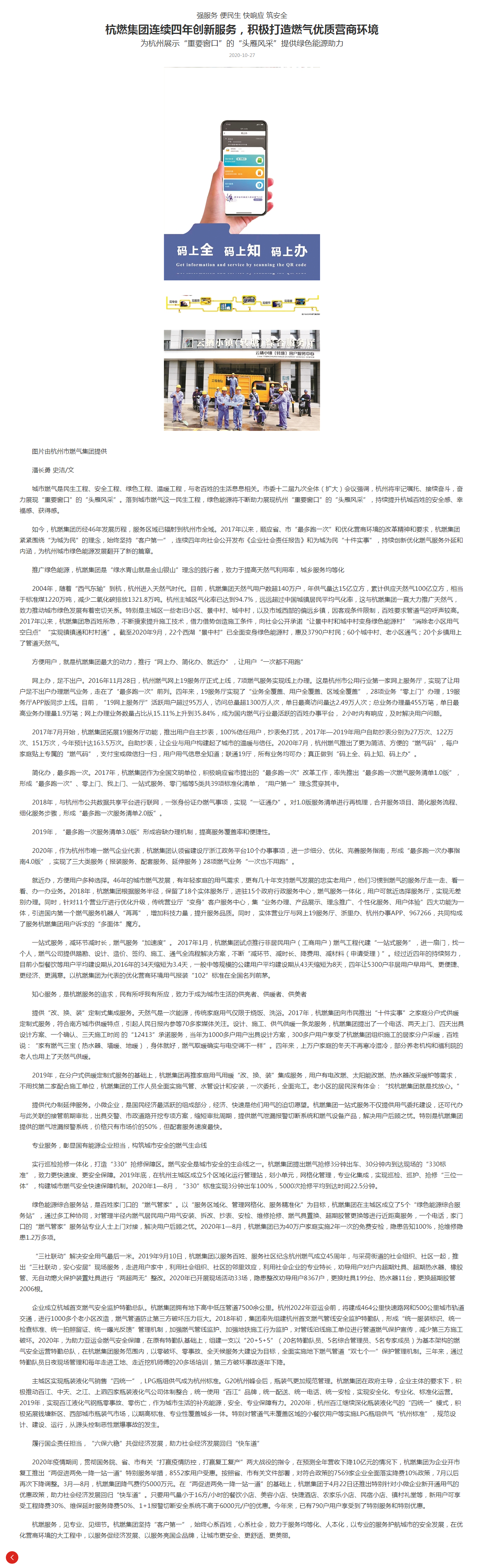 2020年,作为杭州市唯一燃气企业代表,欧美成人视频 认领省建设厅浙江政务平台10个办事事项,进一步细分、优化、完善服务指南,形成“最多跑一次办事指南4.0版”,实现了三大类服务(报装服务、配套服务、延伸服务)28项燃气业务“一次也不用跑”。