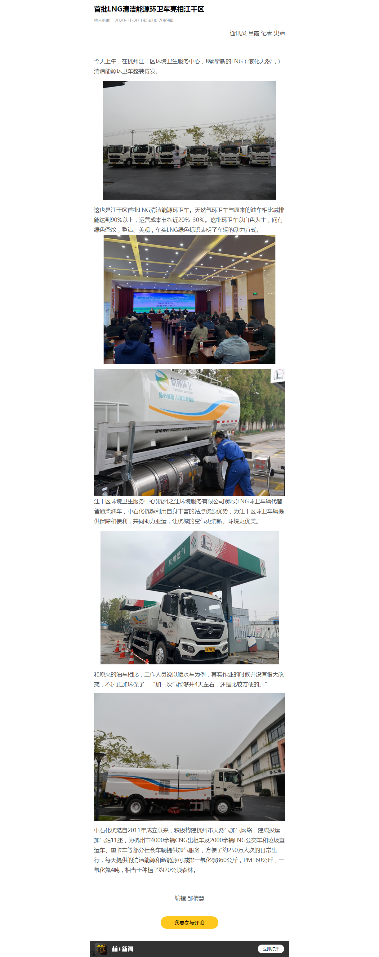 江干区环境卫生服务中心(杭州之江环境服务有限公司)购买LNG环卫车辆代替普通柴油车,中石化杭燃利用自身丰富的站点资源优势,为江干区环卫车辆提供保障和便利,共同助力亚运,让杭城的空气更清新、环境更优美。