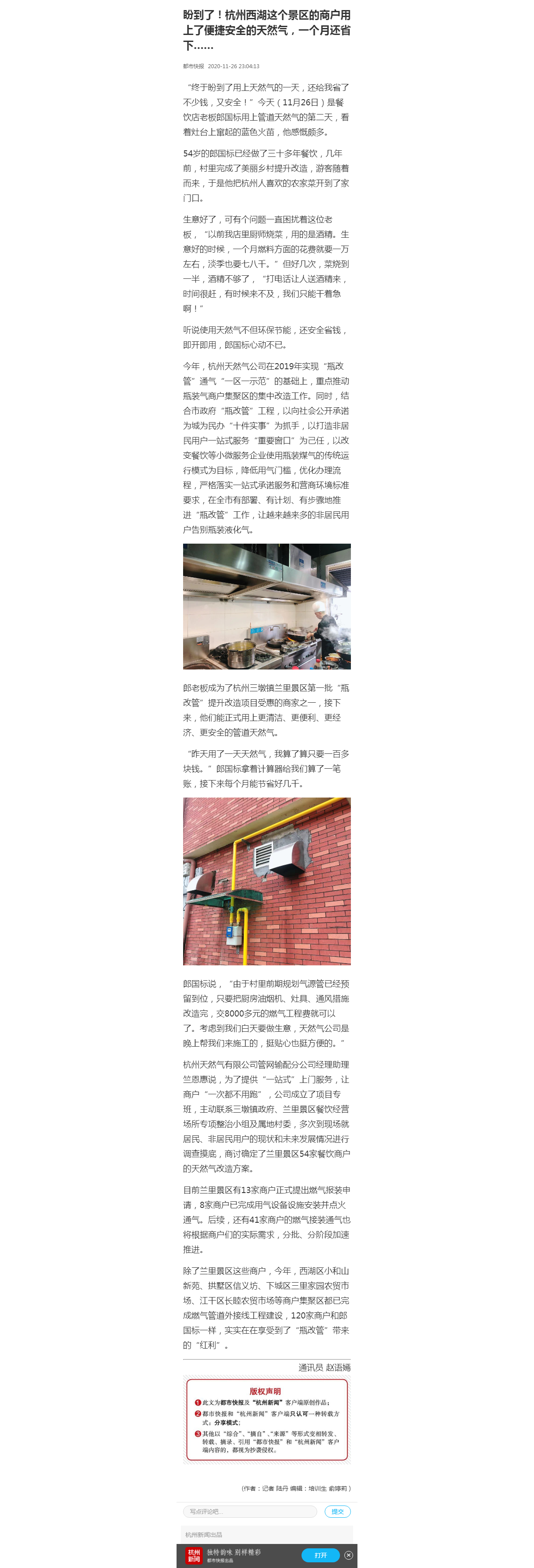 除了兰里景区这些商户,今年,西湖区小和山新苑、拱墅区信义坊、下城区三里家园农贸市场、江干区长睦农贸市场等商户集聚区都已完成燃气管道外接线工程建设,120家商户和郎国标一样,实实在在享受到了“瓶改管”带来的“红利”。