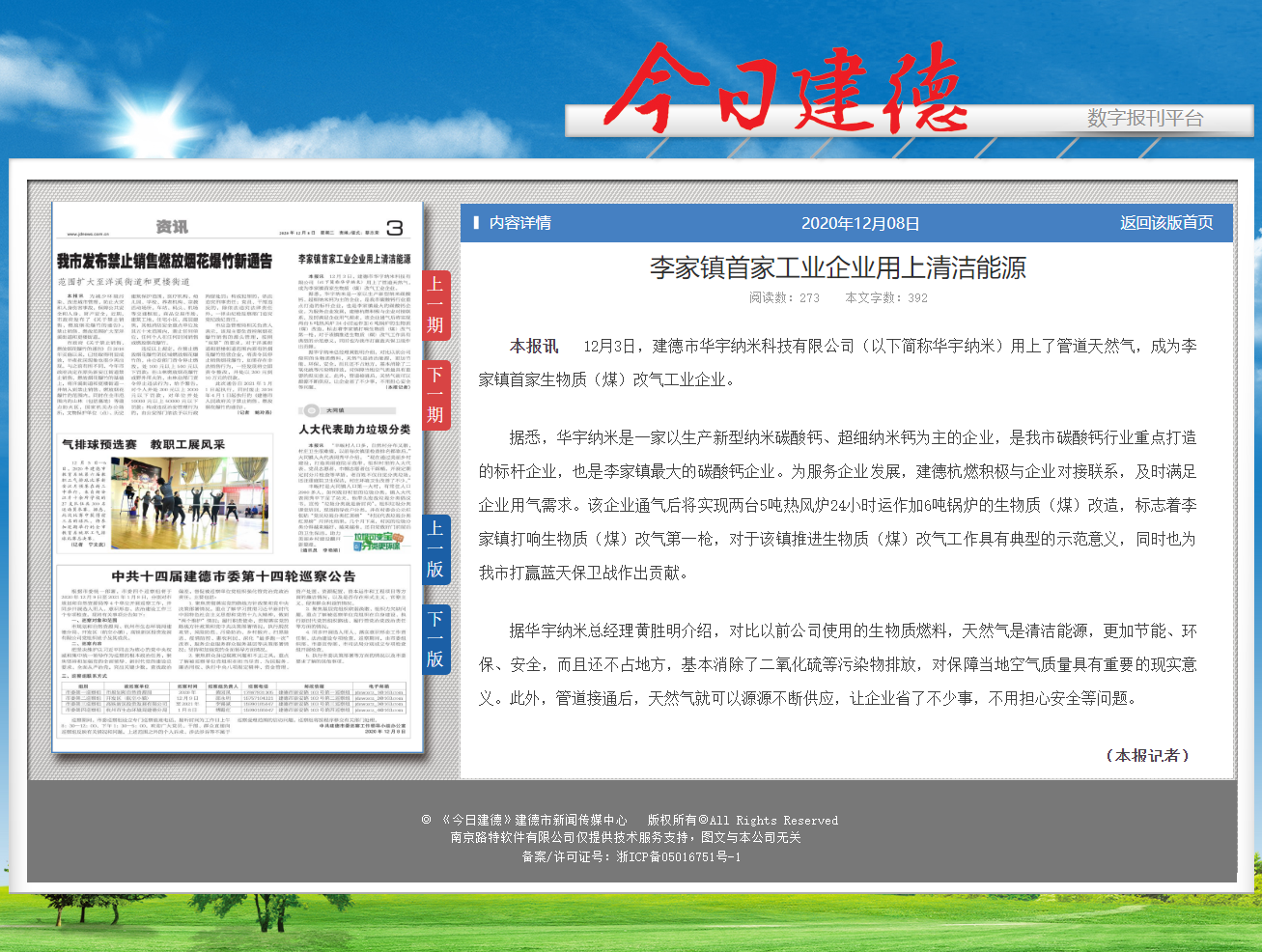 本报讯 12月3日,建德市华宇纳米科技有限公司(以下简称华宇纳米)用上了管道天然气,成为李家镇首家生物质(煤)改气工业企业。