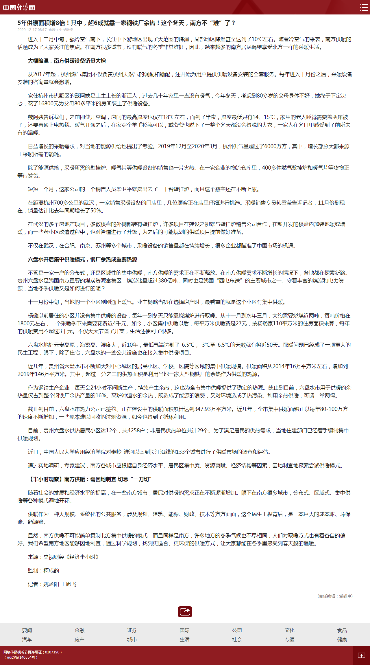 近几年,贵州省六盘水市不断加大对中心城区的居民小区、学校、医院等区域的集中供暖规模。供暖面积从2014年16万平方米左右,增加到2019年146万平方米。其中,超过三分之二的供热面积是利用当地一家大型钢铁厂的余热作为供暖的热源。