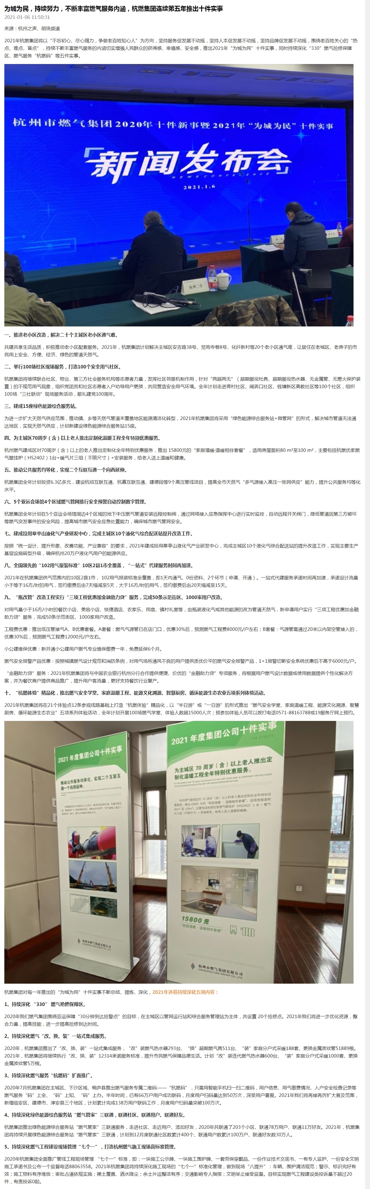 将以“不忘初心、尽心竭力,争做老百姓知心人”为方向,坚持服务促发展不动摇,坚持人本促发展不动摇,坚持品牌促发展不动摇,围绕老百姓关心的“热点、难点、盲点”,持续不断丰富燃气服务的内涵切实增强人民群众的获得感、幸福感、安全感,推出2021年“为城为民”十件实事,同时持续深化“330”燃气抢修保障区、燃气服务“杭燃码”等五件实事。